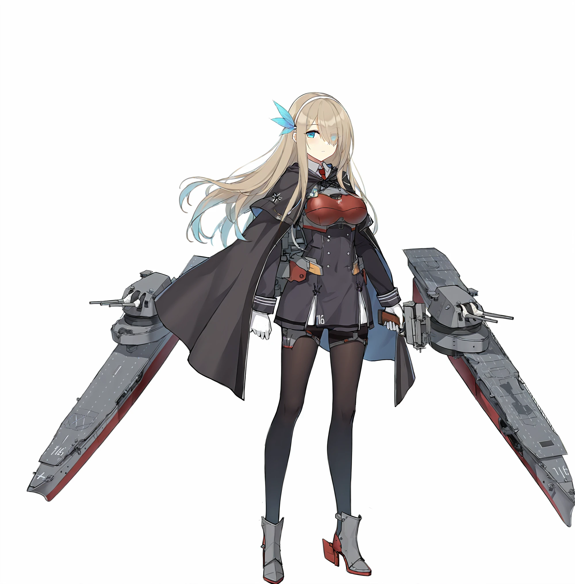 非强制性触发词magazine (weapon), character:lexington (cv-16) (warship girls r), 1girl, solo, flight deck, full body, rigging, long hair, black pantyhose, white gloves, red necktie, rudder footwear, machinery, long sleeves, black cape, turret, standing, closed mouth, holding, looking at viewer, gun, skirt, black dress, expressionless, tachi-e, short dress, feather hair ornament, blue feather hair ornament, blue eyes, chest guard, red chest guard, large breasts, armored boots, framed breasts, blue feathers, adapted turret, white hairband, anti-aircraft gun, cannon, eyes visible through hair