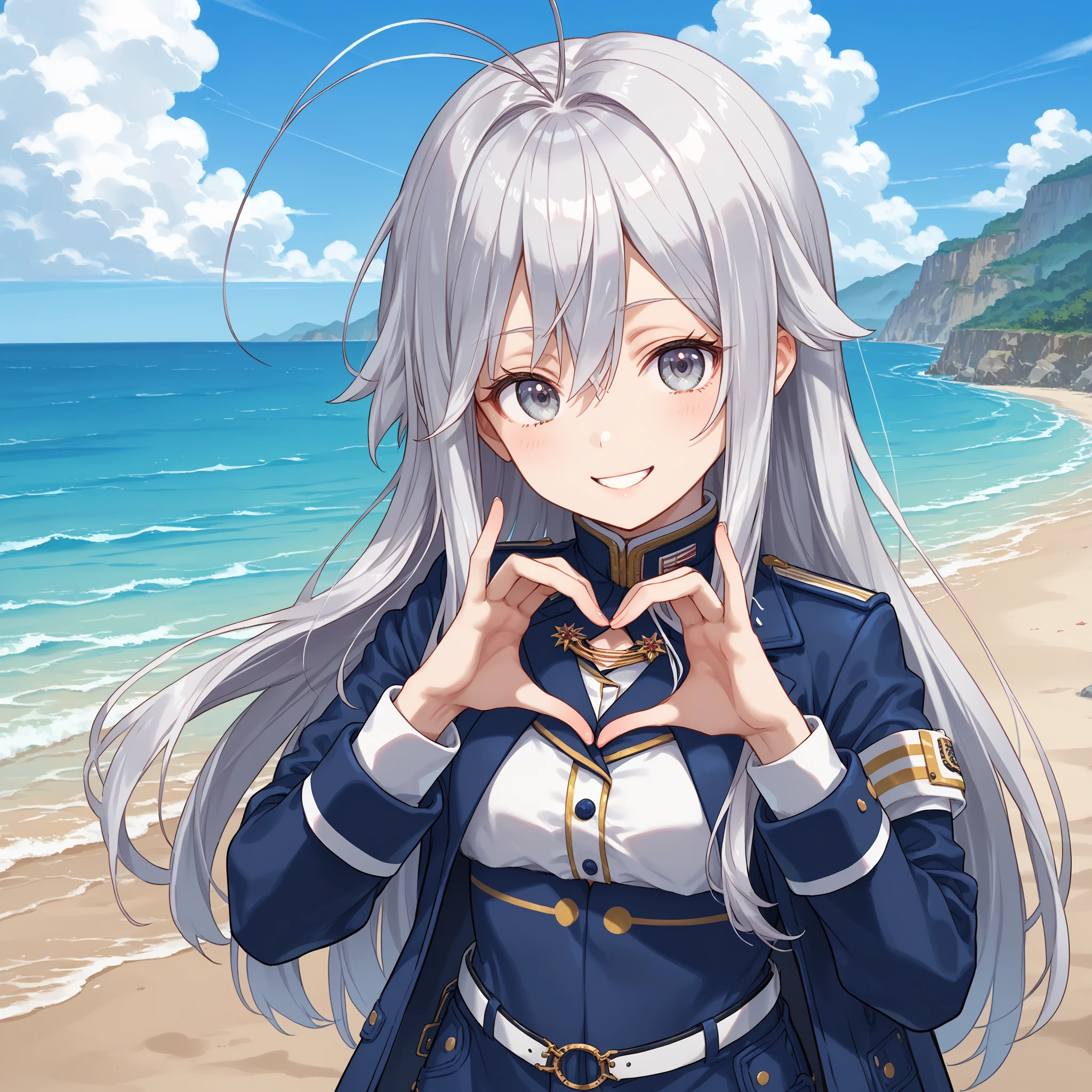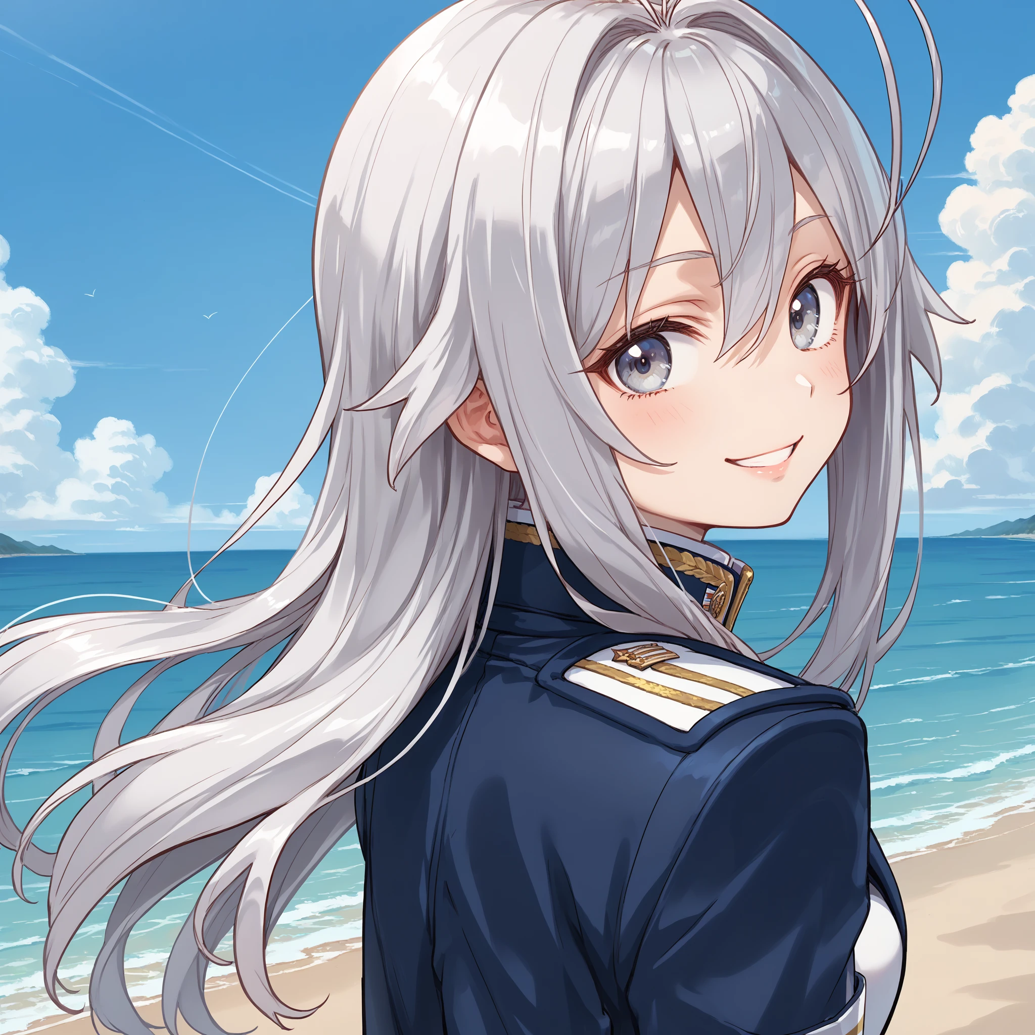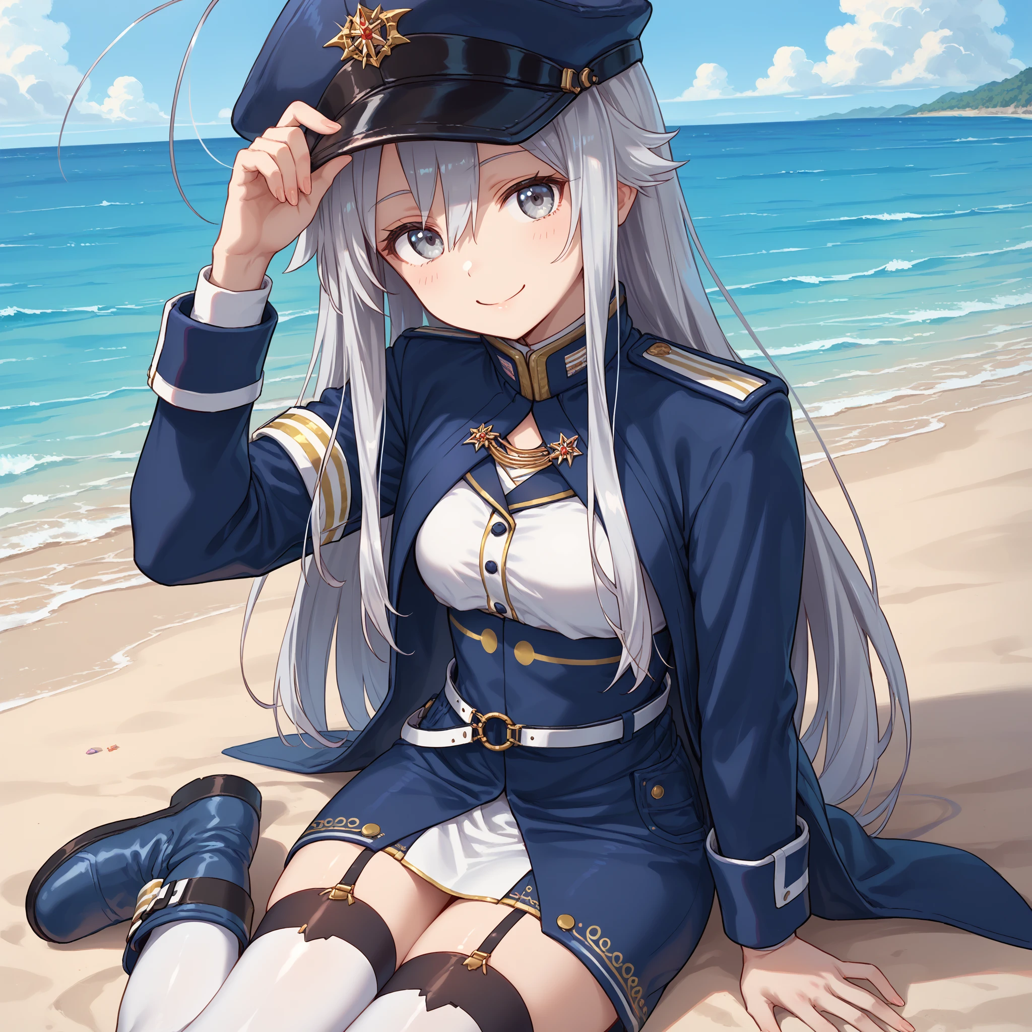 Military Uniform : vladilena millize, antenna hair, grey hair, grey eyes, white hair, long hair, white shirt, blue jacket, military uniform, white thighhighs, garter straps, collared jacket, high collar, o-ring belt, long sleeves, armband, blue skirt,Description