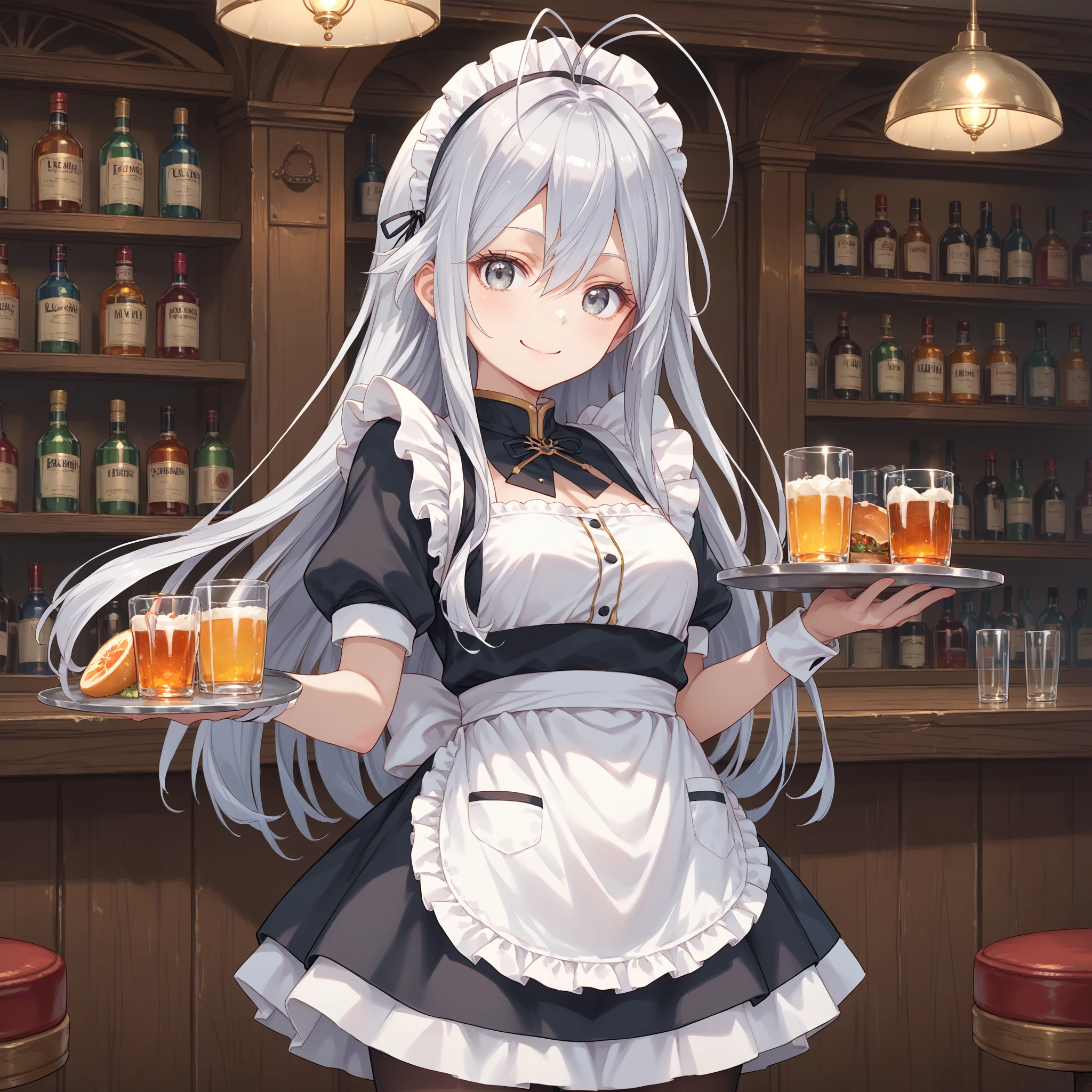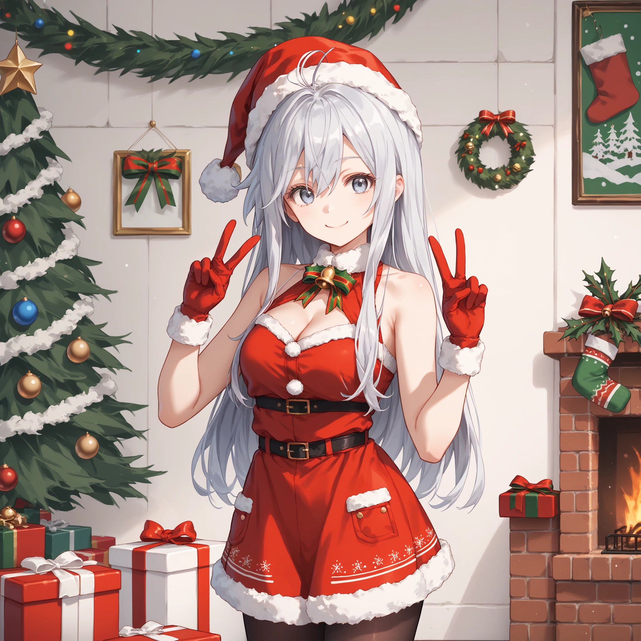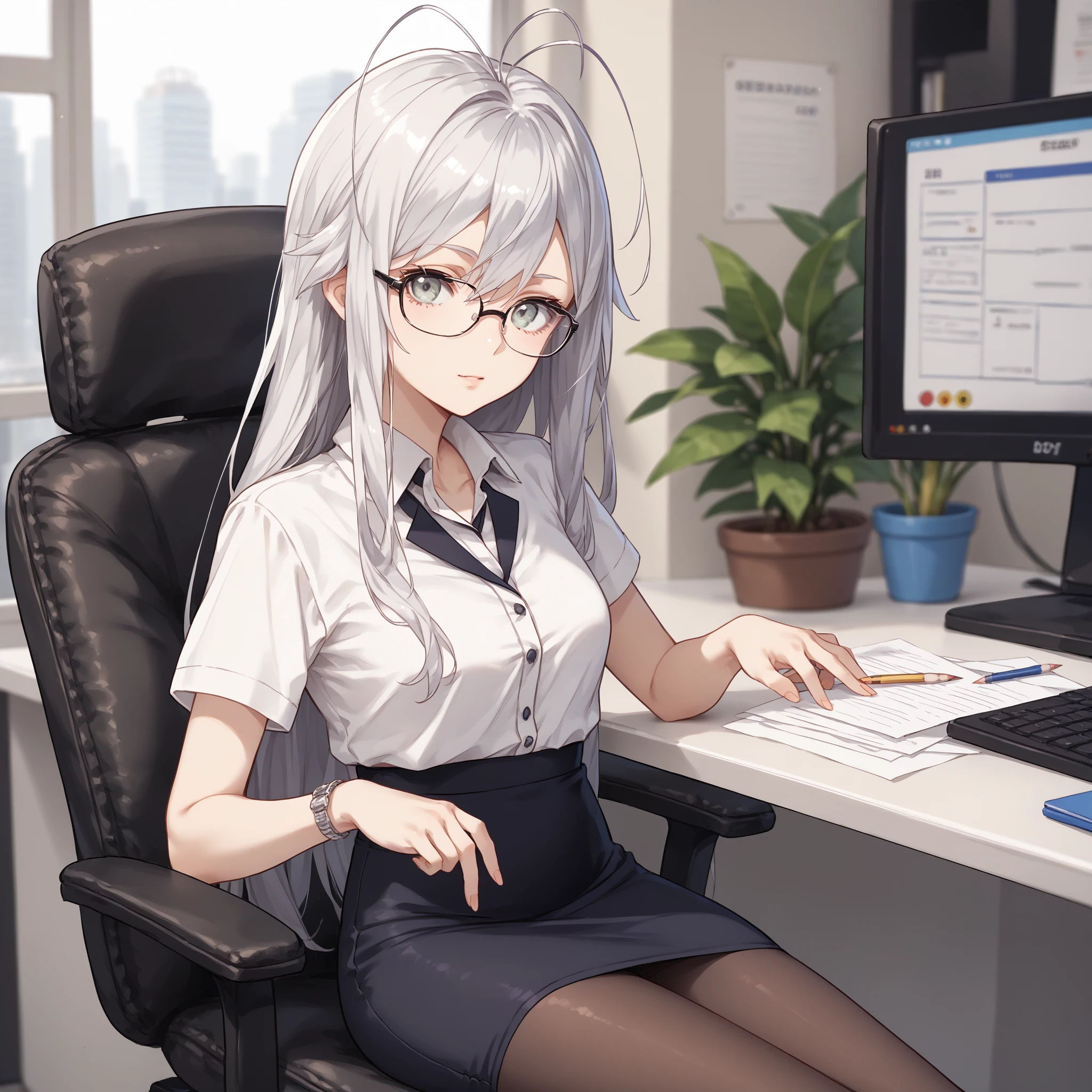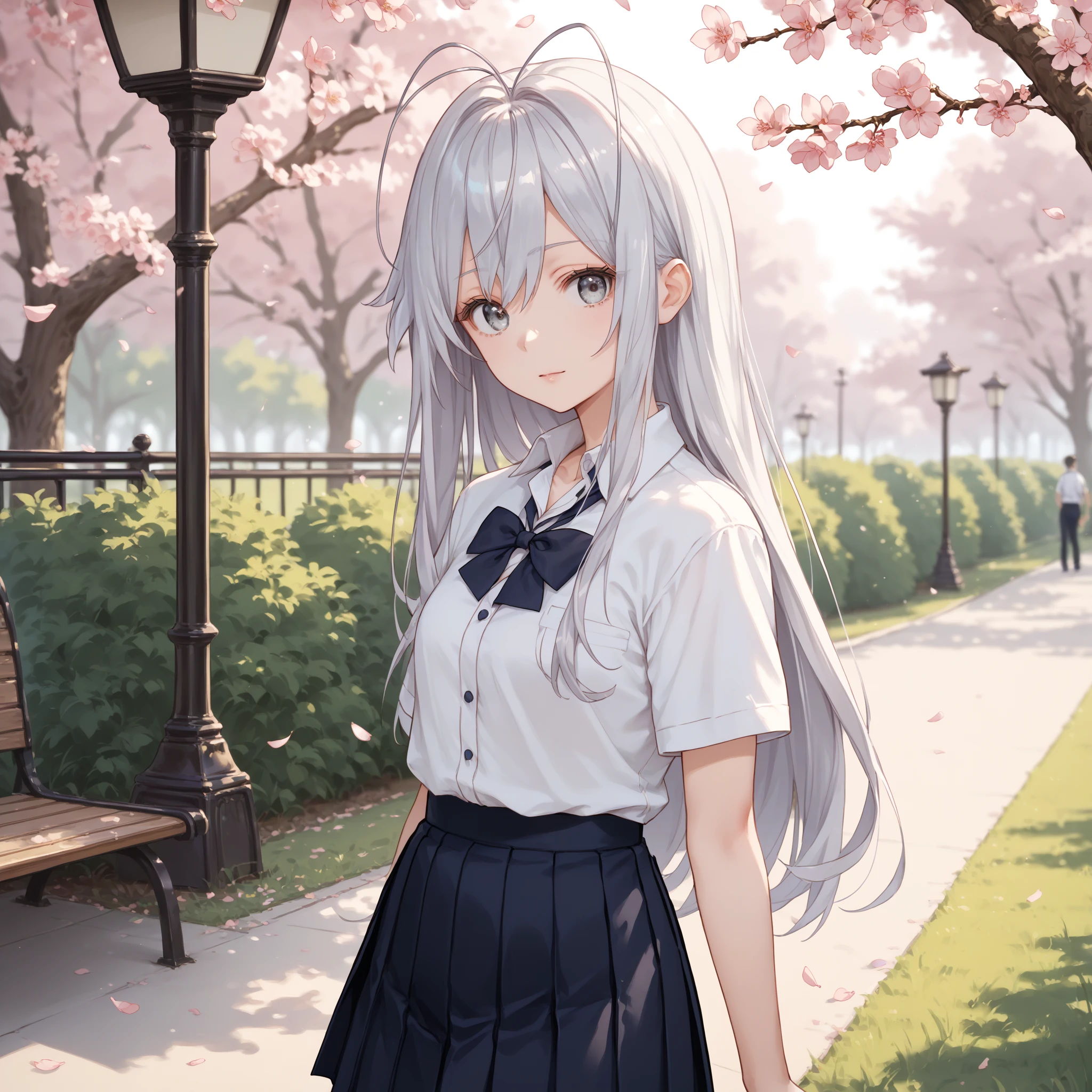 Military Uniform : vladilena millize, antenna hair, grey hair, grey eyes, white hair, long hair, white shirt, blue jacket, military uniform, white thighhighs, garter straps, collared jacket, high collar, o-ring belt, long sleeves, armband, blue skirt,Description