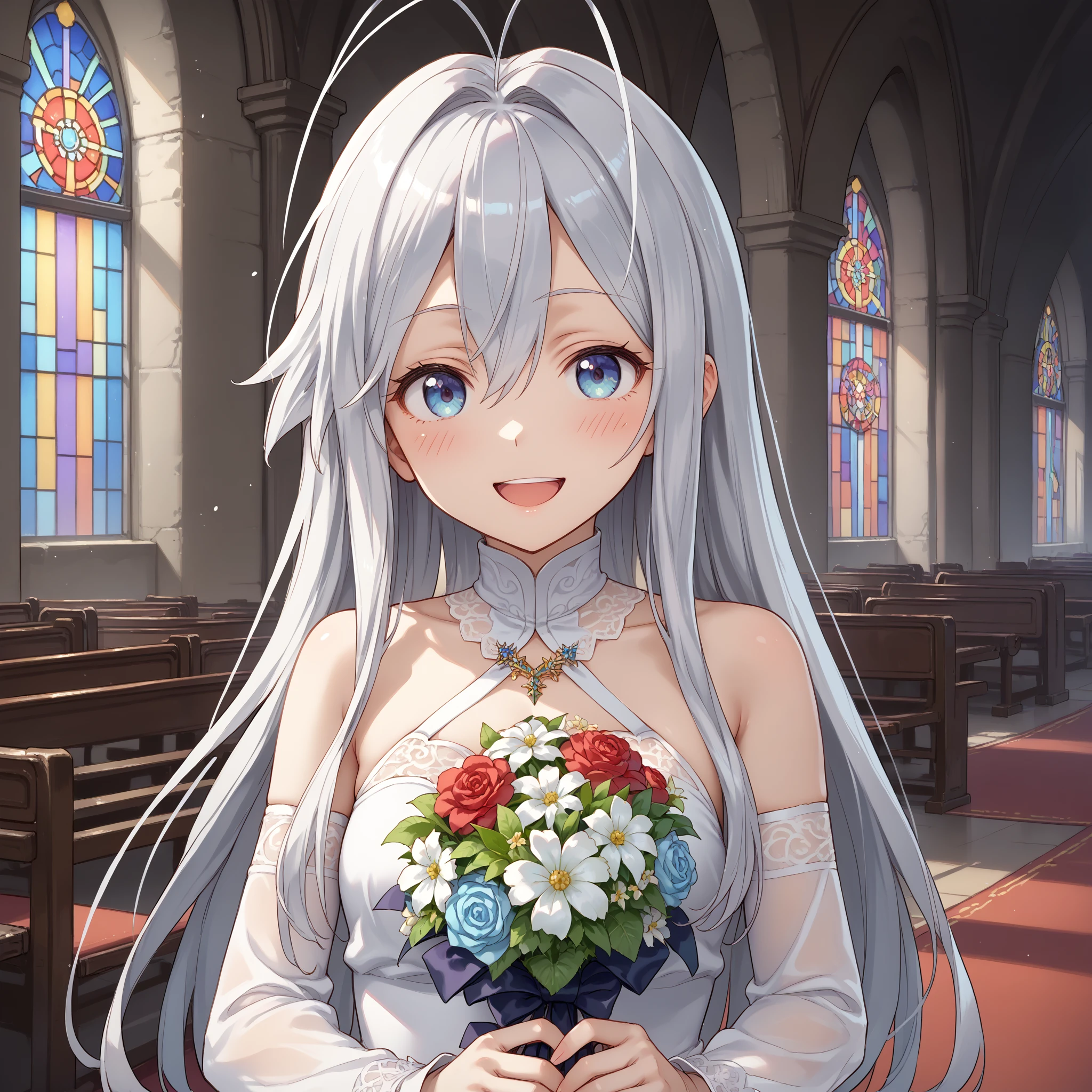 vladilena millize, antenna hair, grey hair, grey eyes, white hair, long hair, white shirt, blue jacket, military uniform, white thighhighs, garter straps, collared jacket, high collar, o-ring belt, long sleeves, armband, blue skirt,