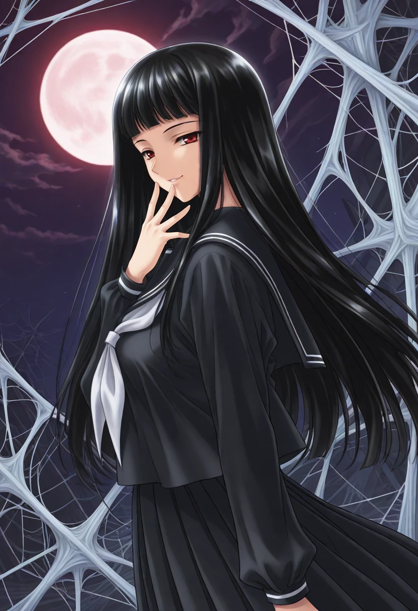 black hair, long hair, red eyes, hime cut, blunt bangs