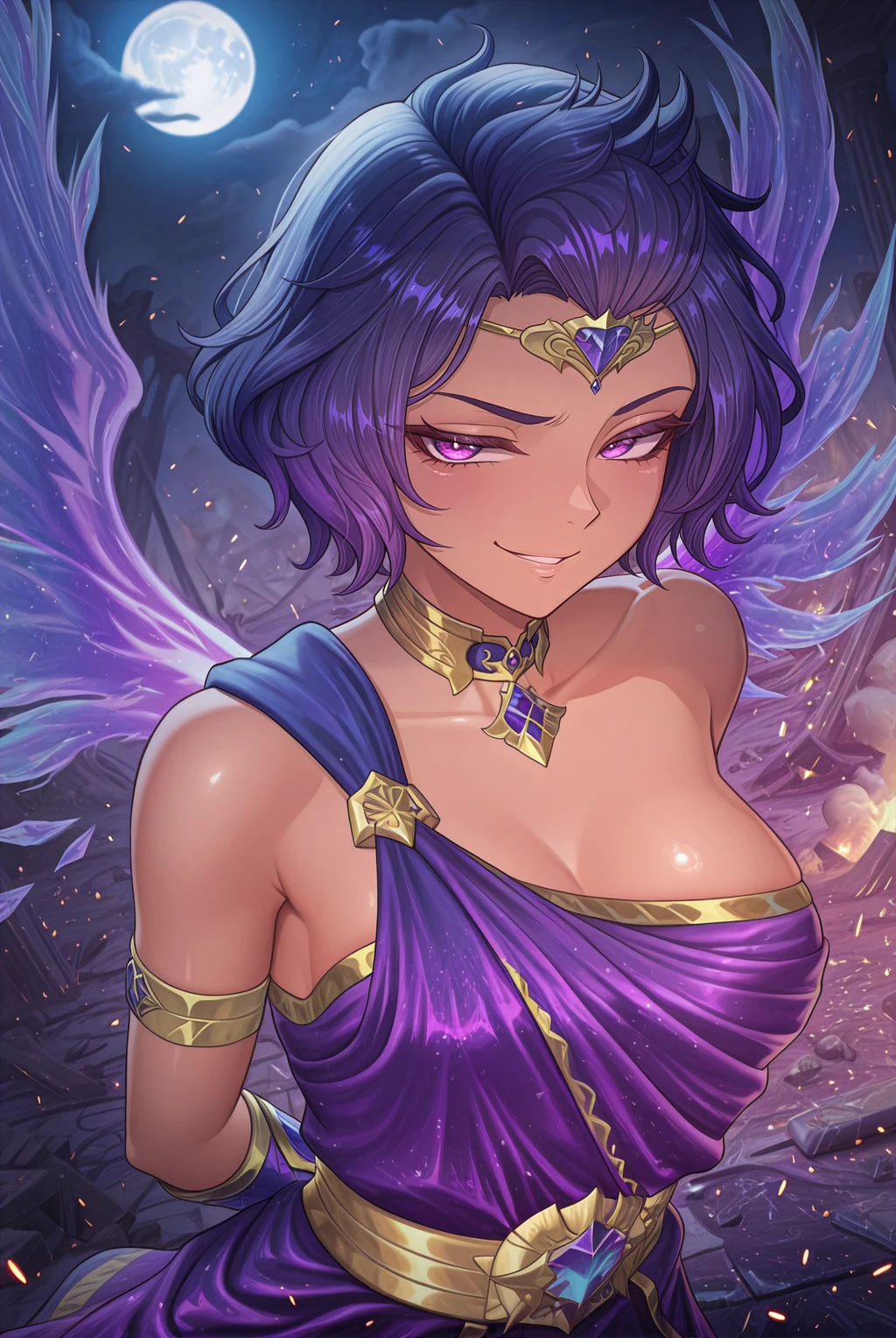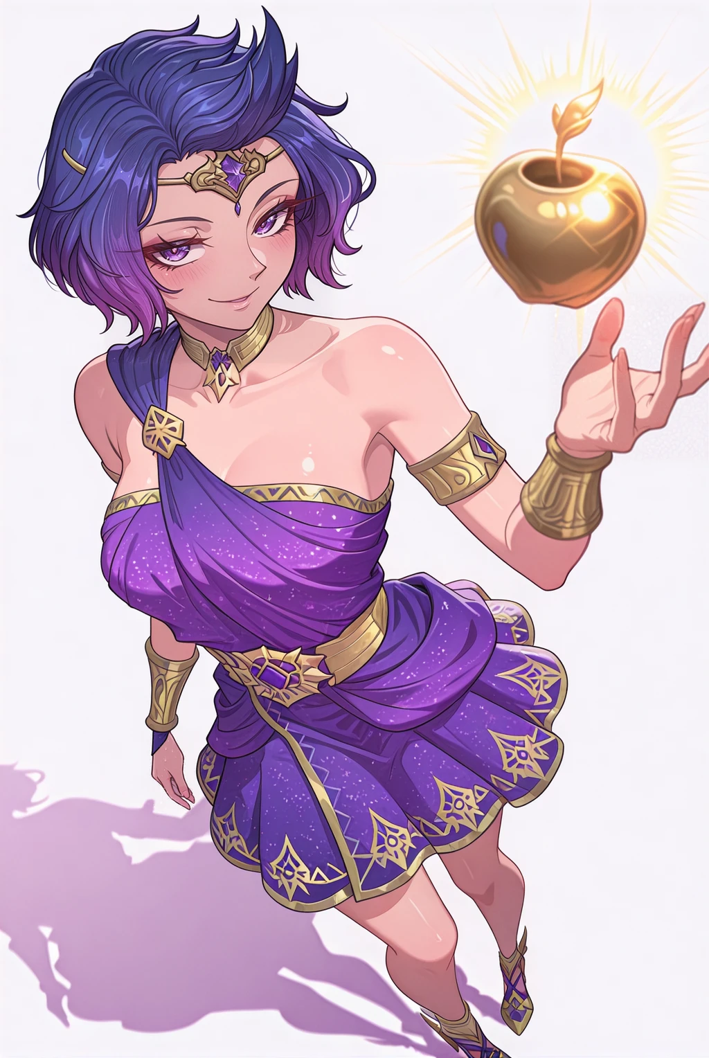 discordia_zthx_IL, multicolored hair, blue hair, purple hair, short hair, bare shoulders, purple eyes, ornate golden diadem, golden choker, medium breasts