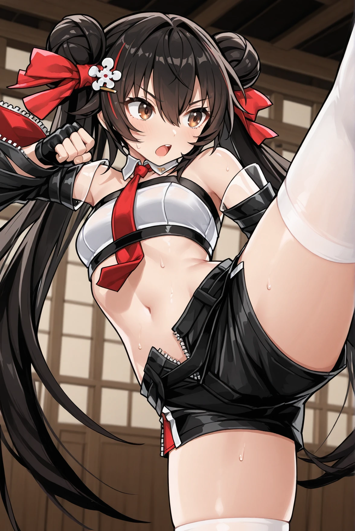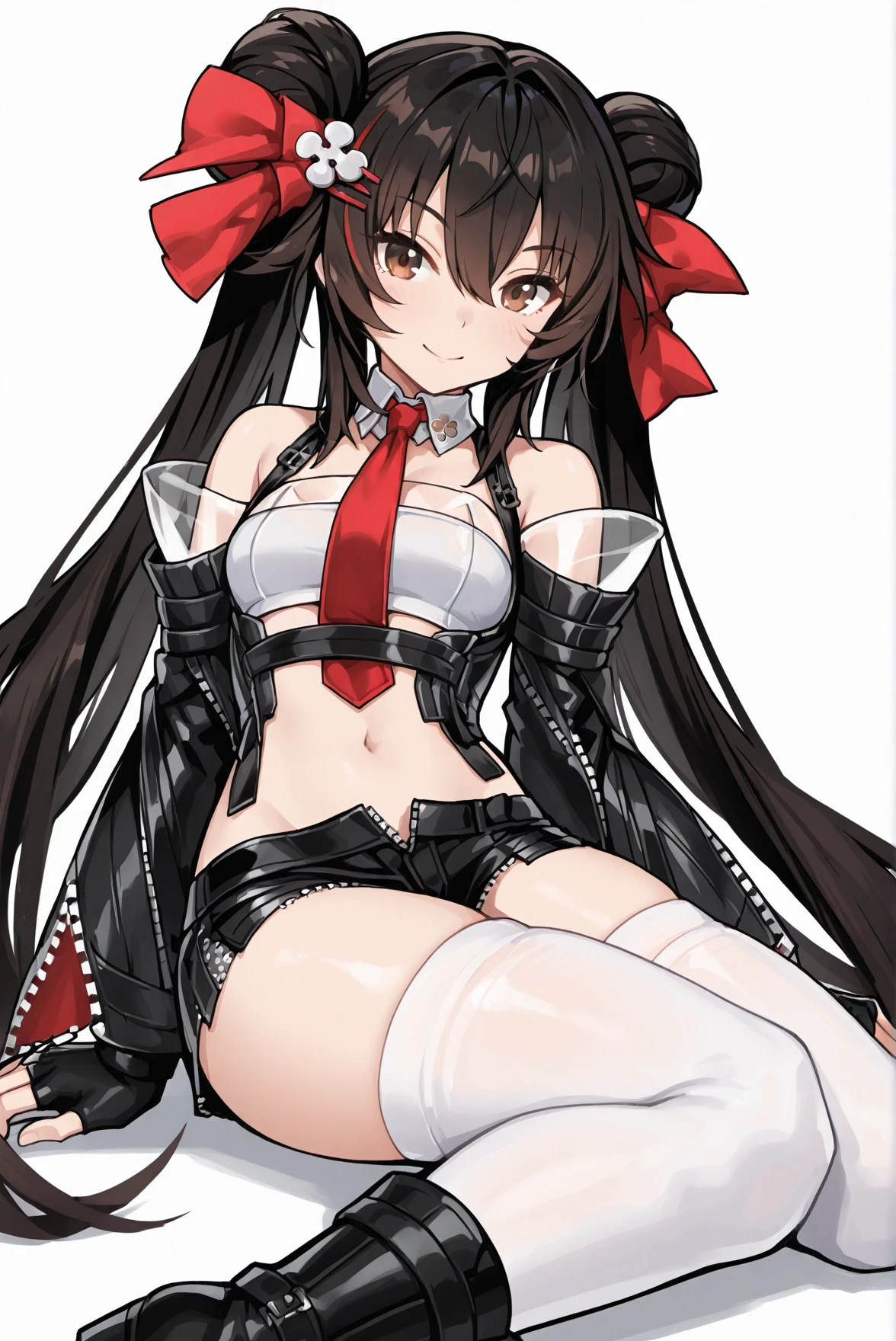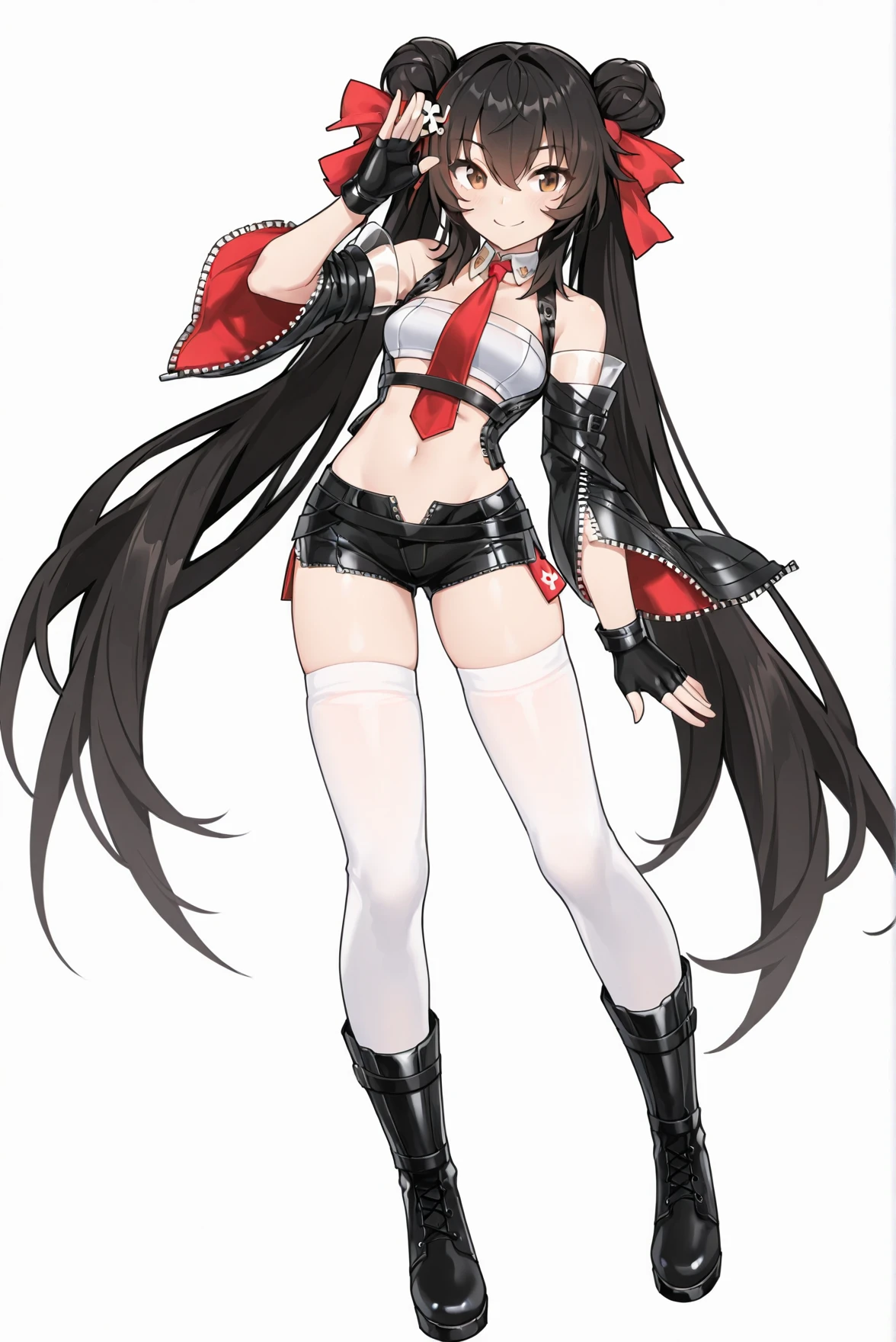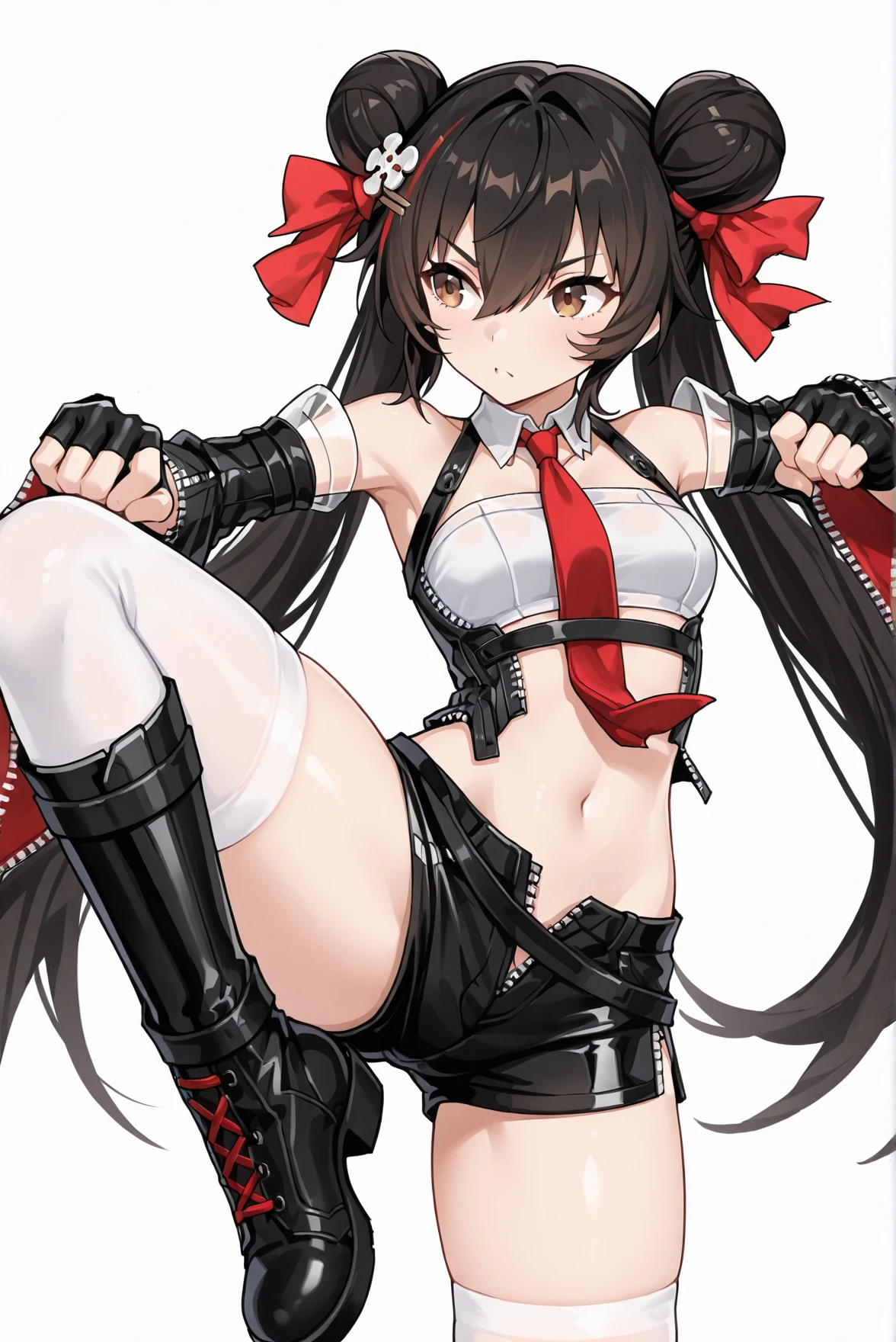 outfit: necktie, detached collar, white crop top, shoulders, detached sleeves, belt, wide sleeves, fingerless gloves, navel, midriff, unzipped short shorts, thighhighs, boots