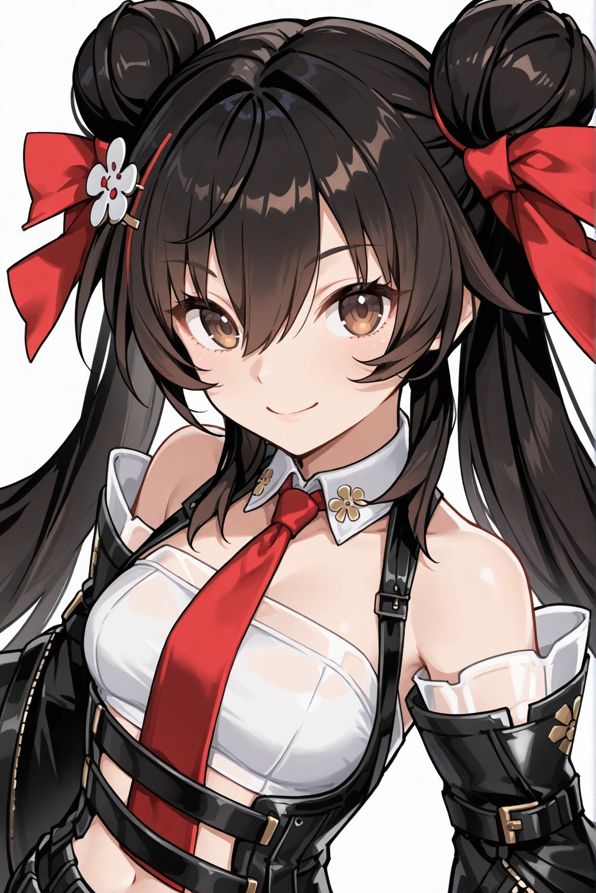 prompt: hair bun, long hair, bangs, brown eyes, black hair, hair ornament, bow, ribbon, hair between eyes, twintails