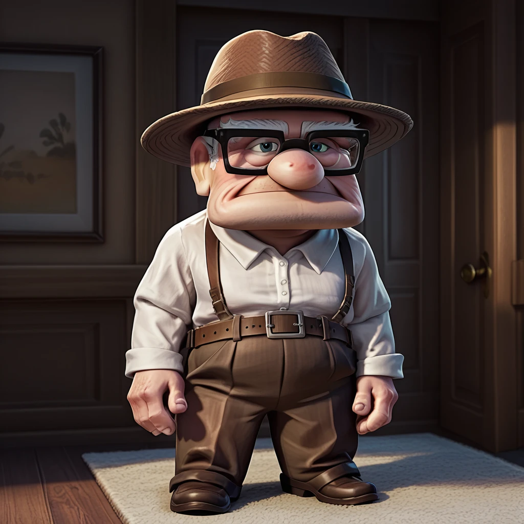 wrinkled skin,glasses, chubby,beard stubble, solo,white shirt, brown suspender pants, brown footwear