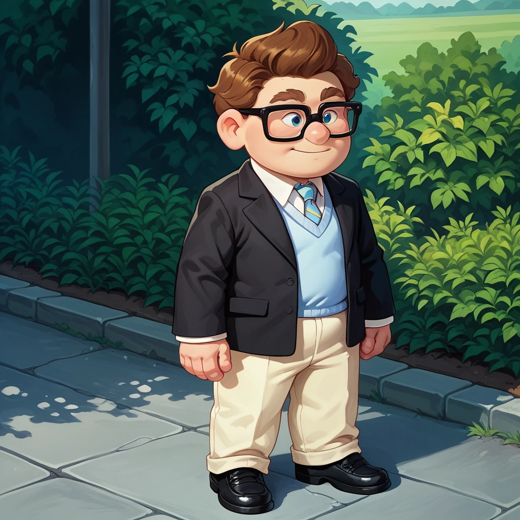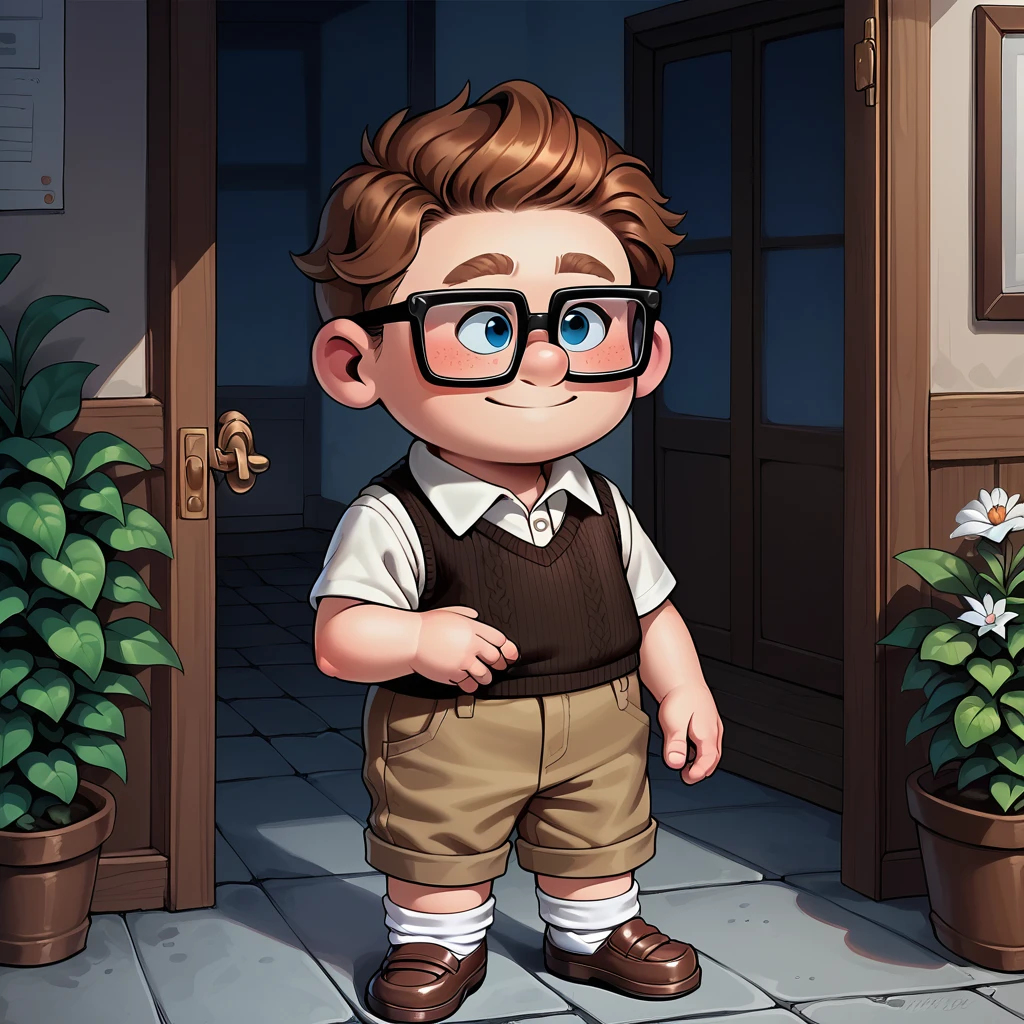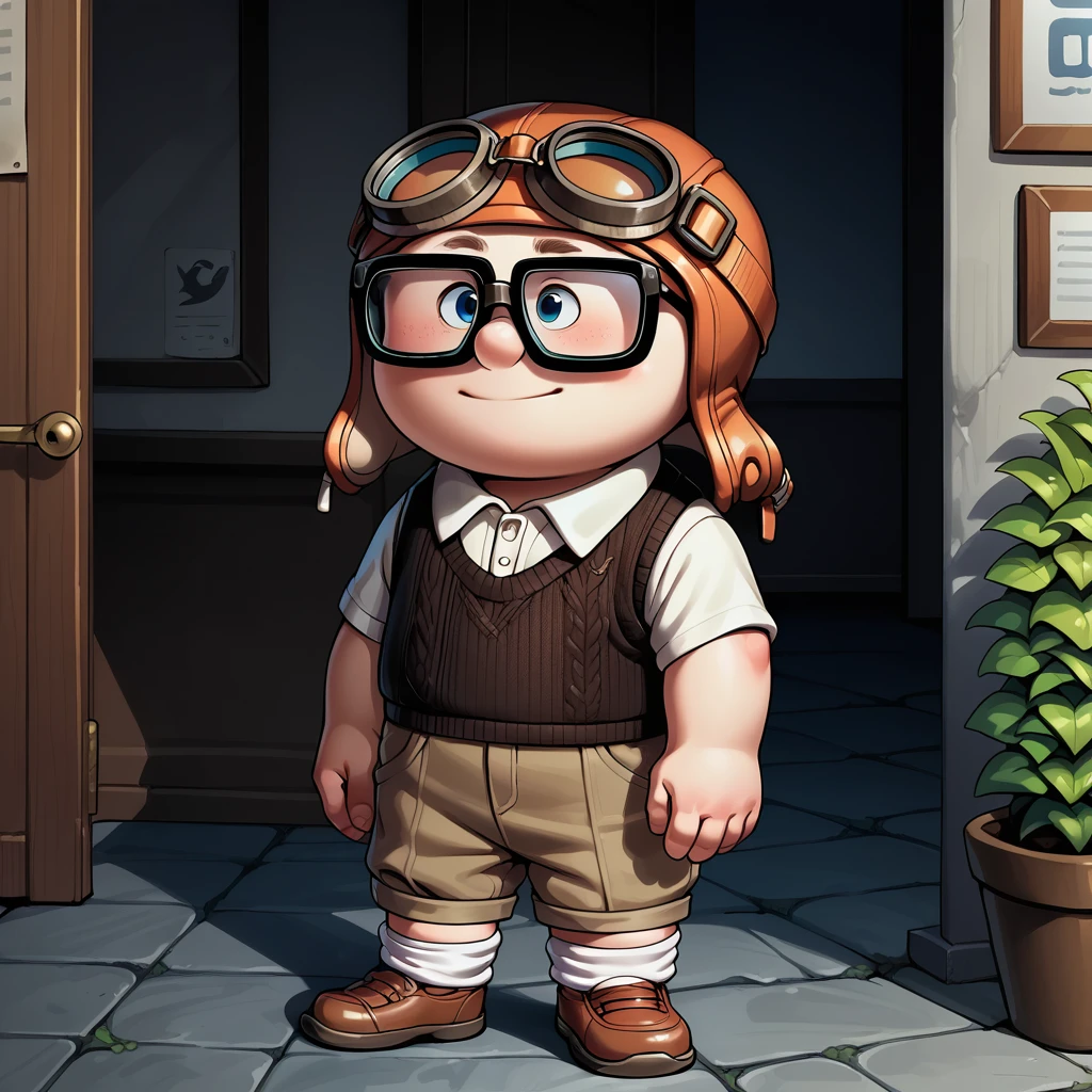 0.1, 1boy, (child:1.2), chubby, glasses, solo,goggles on headwear, grey sweater vest, brown_pants rolled_up, white socks, brown shoes,