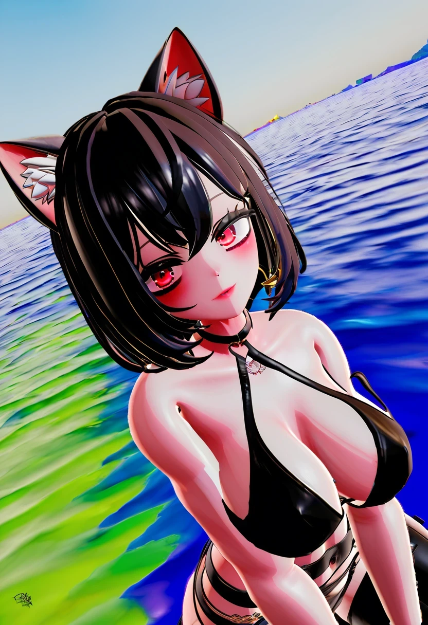 FoxRainVRC, 3d, 3d render, vrchat avatar, black hair, pinkish red eyes,