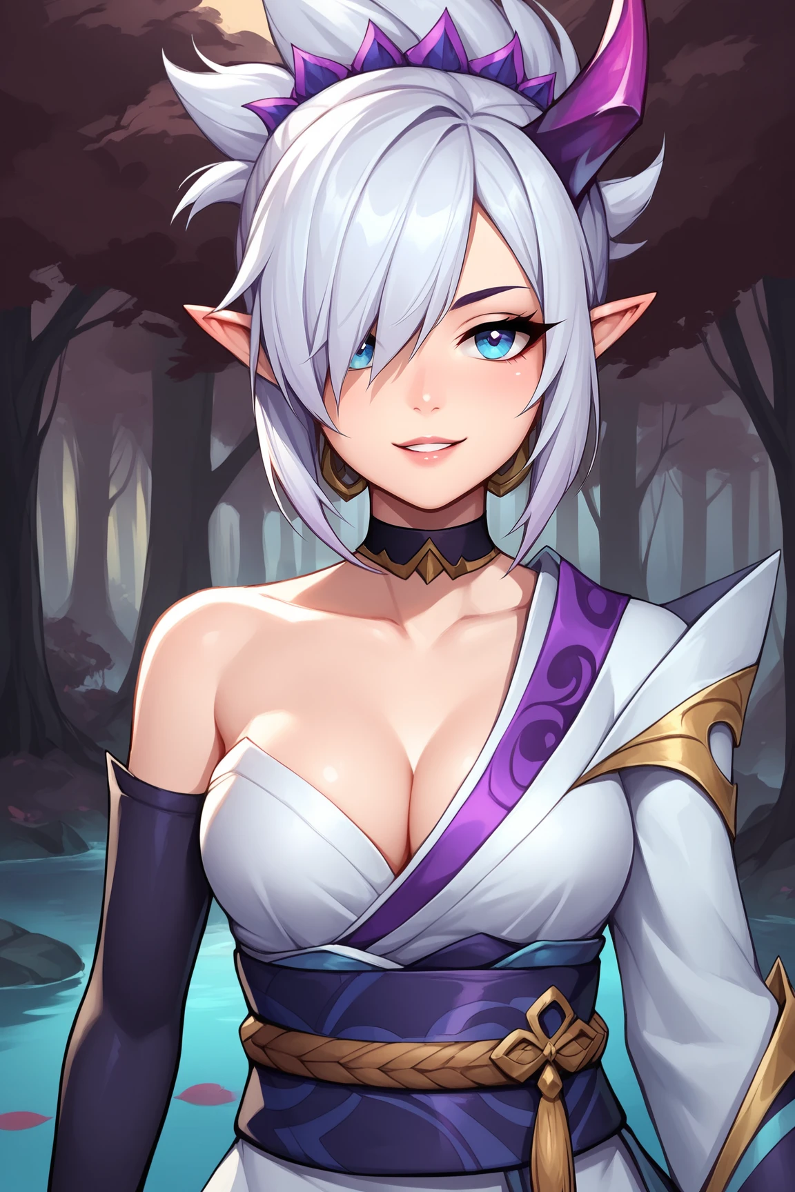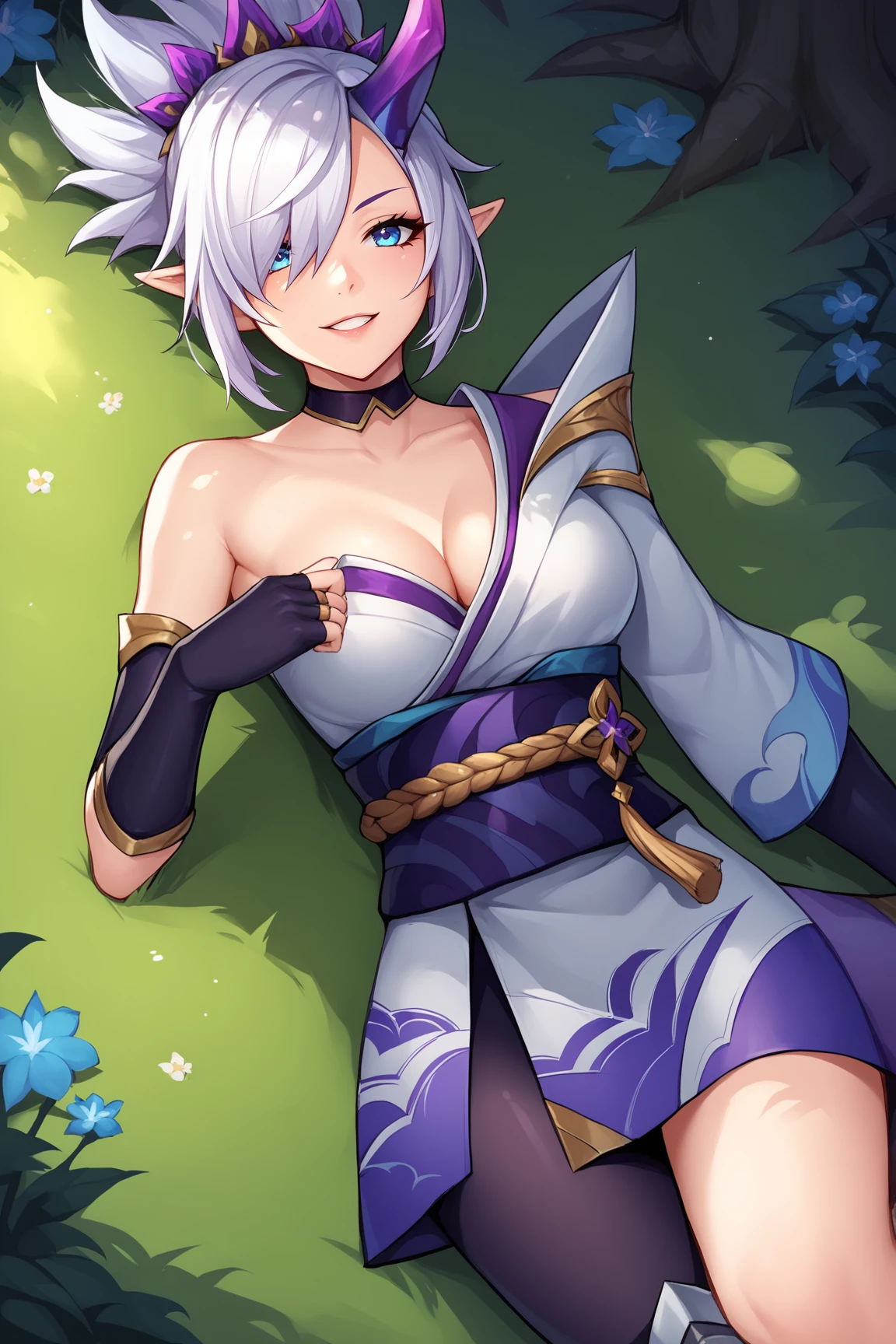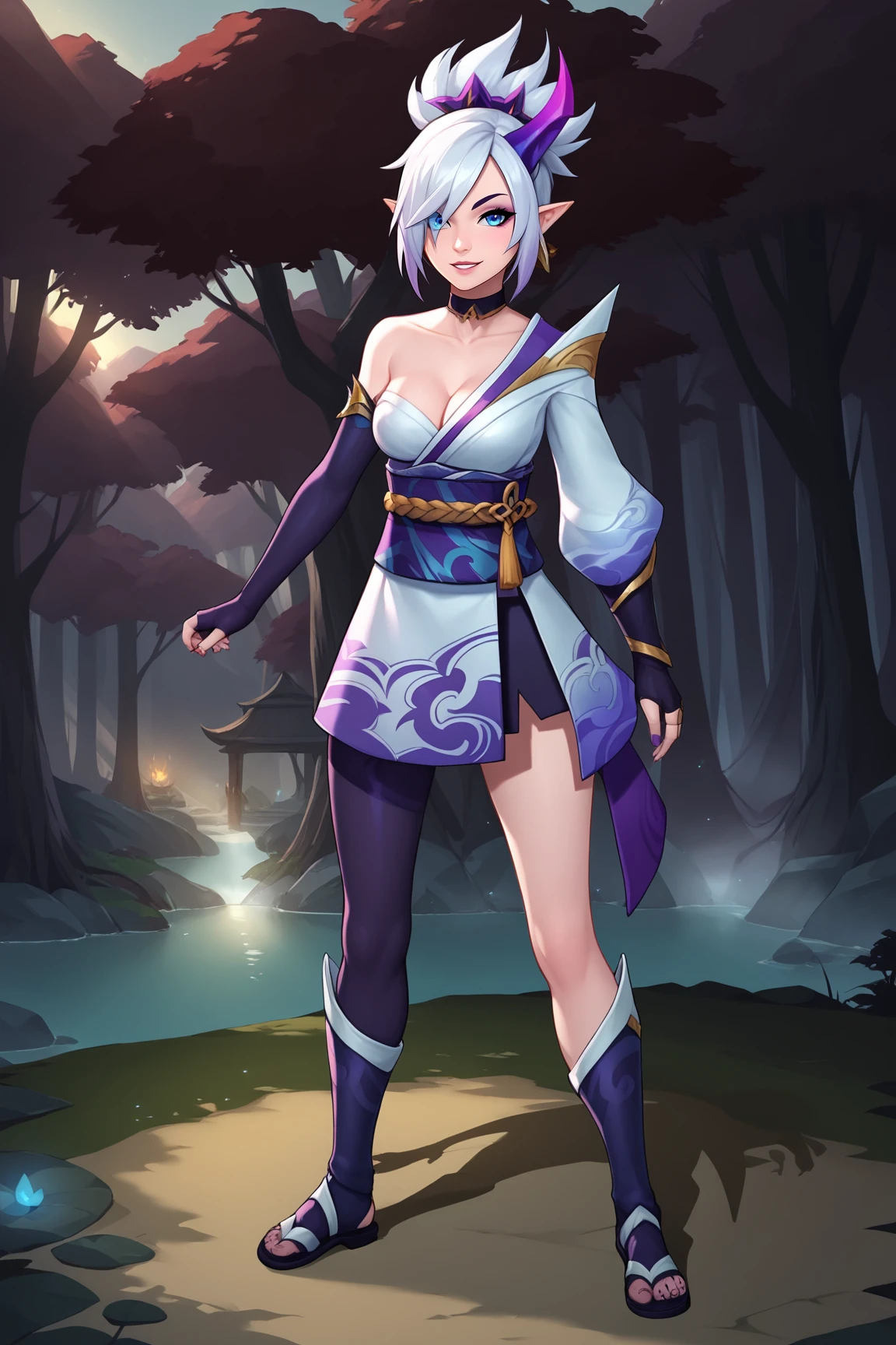 ➜ RivenSBXL, blue eyes, white hair, short hair, hair over one eye, sidelocks, single horn, hair ornament, pointy ears, medium breasts, black choker, collar bone, single bare shoulder, cleavage, white kimono, purple sash, multicolored sash, purple elbow gloves, fingerless gloves, purple pants, asymmetrical clothes, greaves, purple sandals