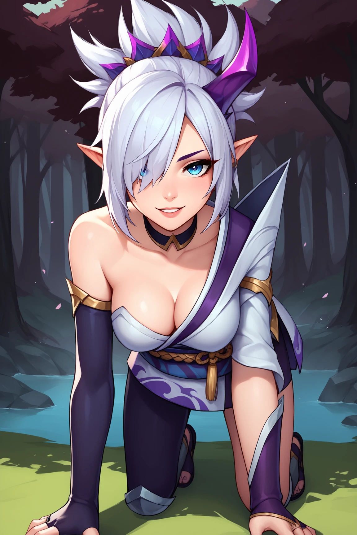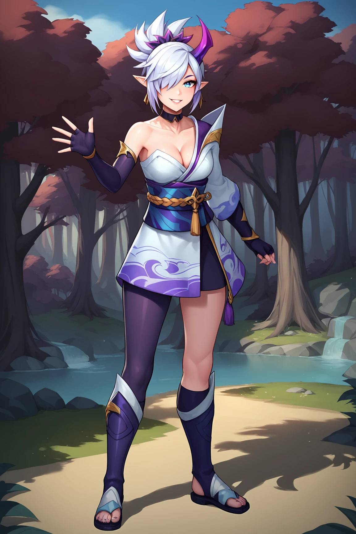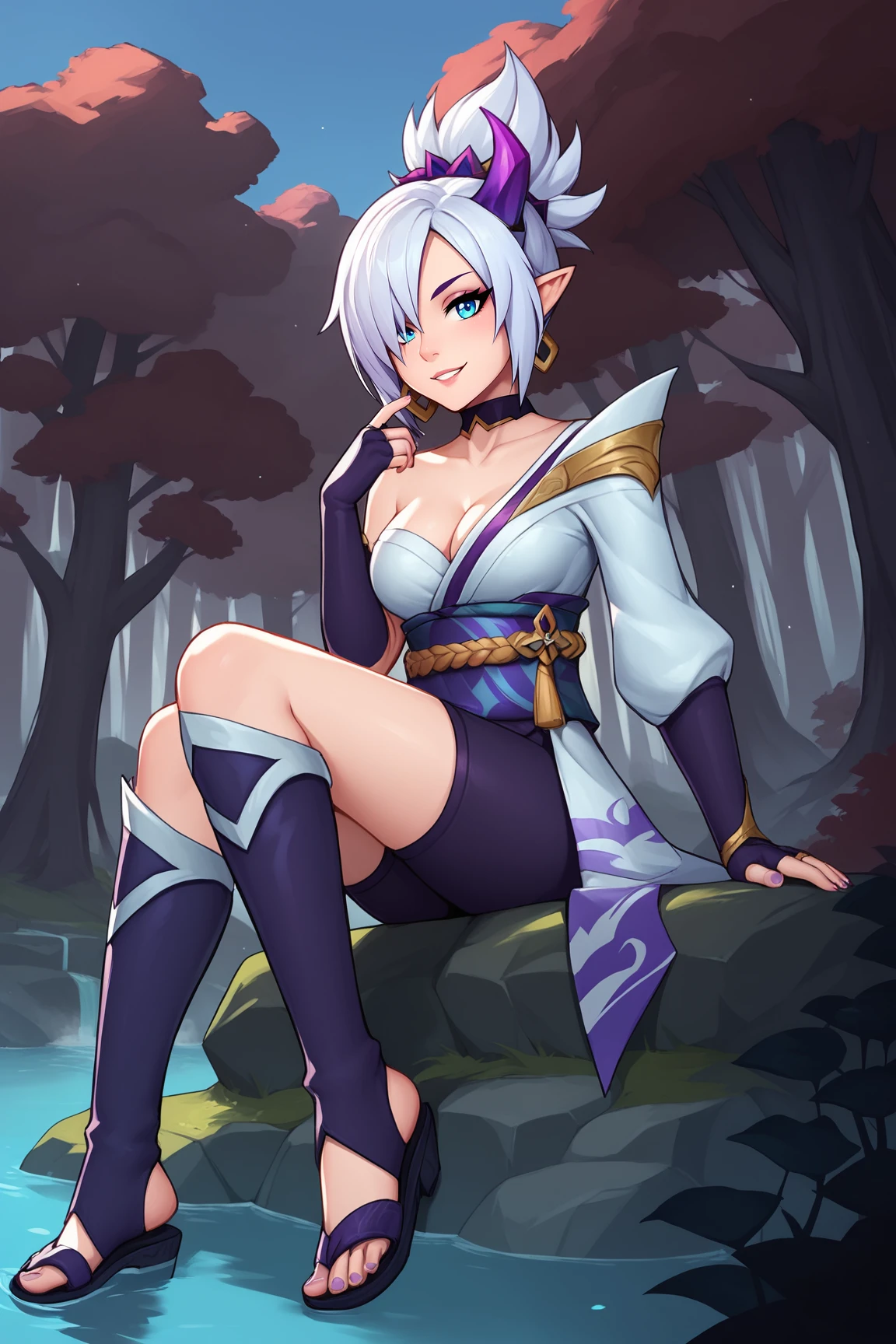➜ RivenSBXL, blue eyes, white hair, short hair, hair over one eye, sidelocks, single horn, hair ornament, pointy ears, medium breasts, black choker, collar bone, single bare shoulder, cleavage, white kimono, purple sash, multicolored sash, purple elbow gloves, fingerless gloves, purple pants, asymmetrical clothes, greaves, purple sandals