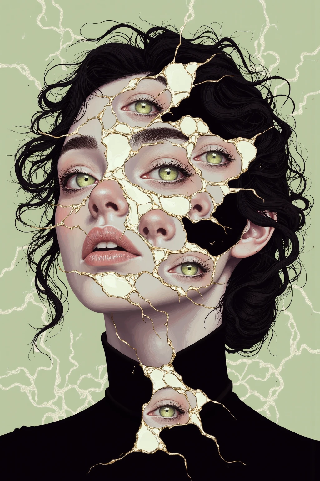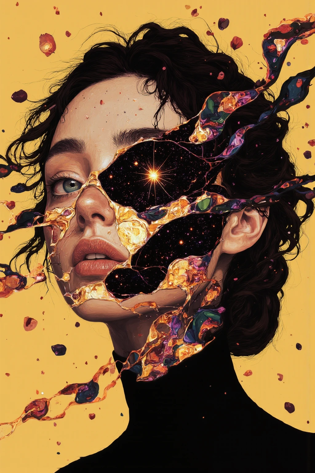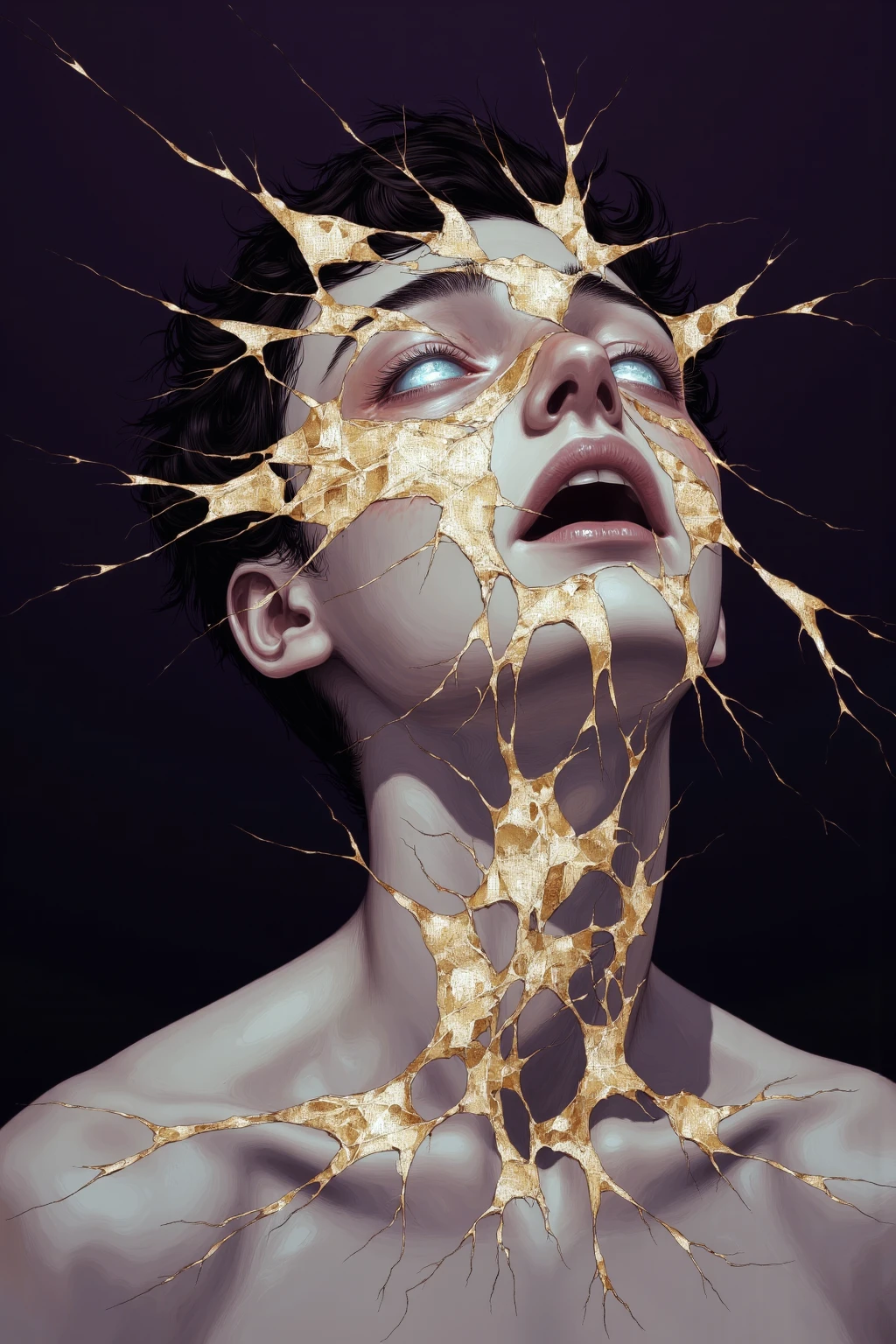 This style explores surreal and ethereal aesthetics, blending fragmented or deconstructed human forms with metallic elements, flowing textures, and luminous patterns. The compositions often emphasize abstract beauty, distorted realities, and otherworldly atmospheres, combining organic and mechanical elements into cohesive, visually striking portraits.