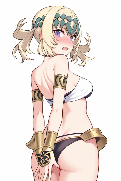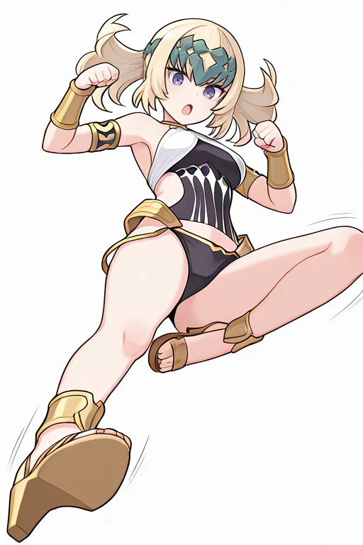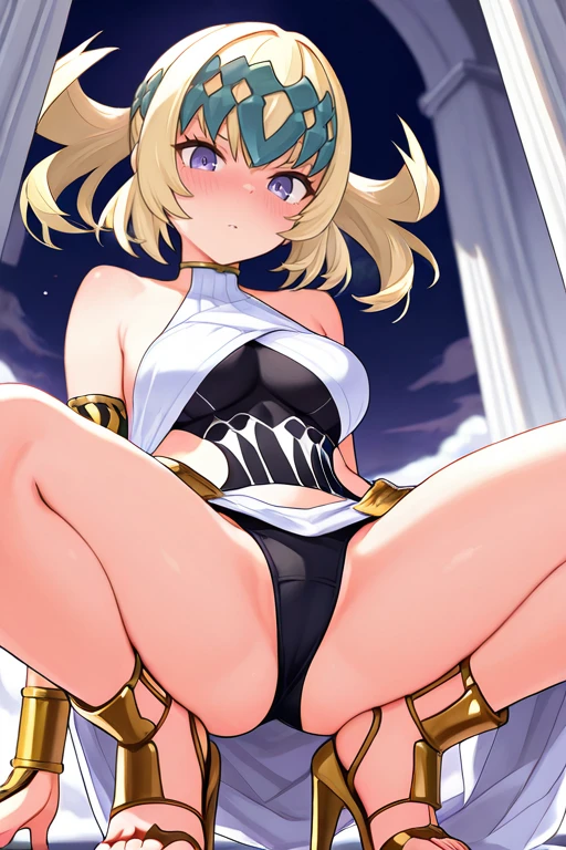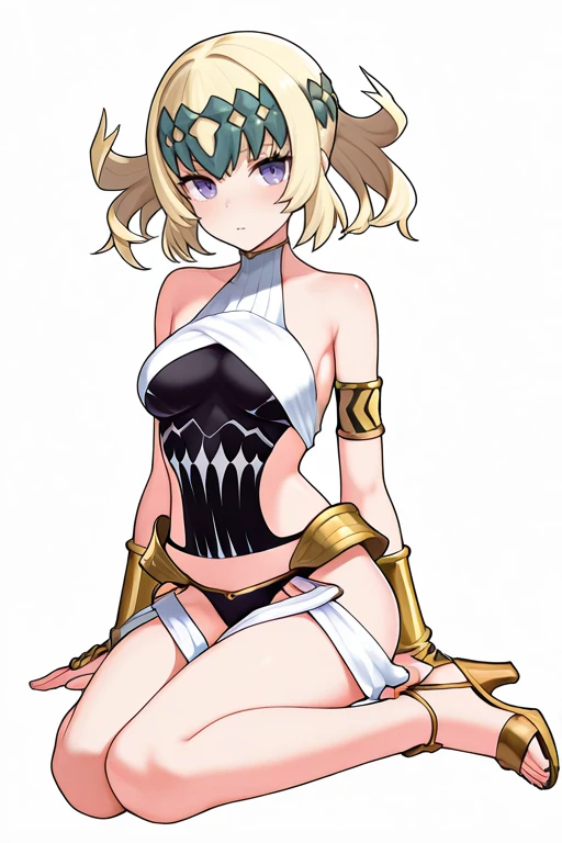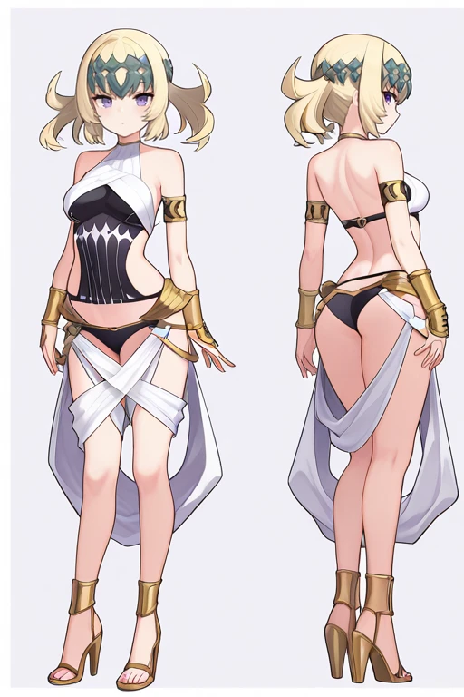 medium breasts, polluxdef, halterneck, armlet, bracer, black panties, high heel sandals, gold footwear, white robe,