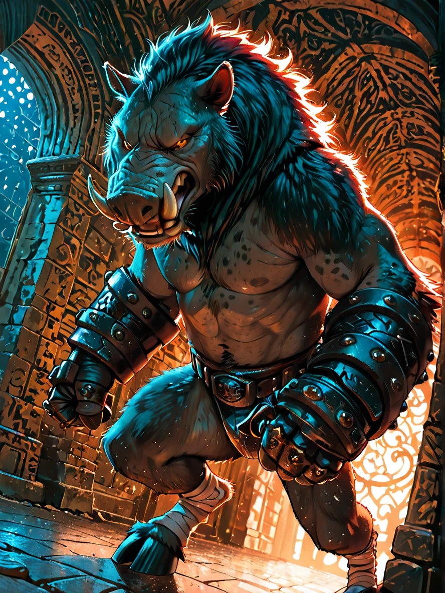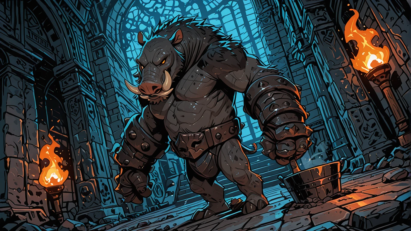“A towering boar-like humanoid with cracked tusks, ritual scars, and glowing eyes, standing in a misty battlefield under blood-red skies.”
