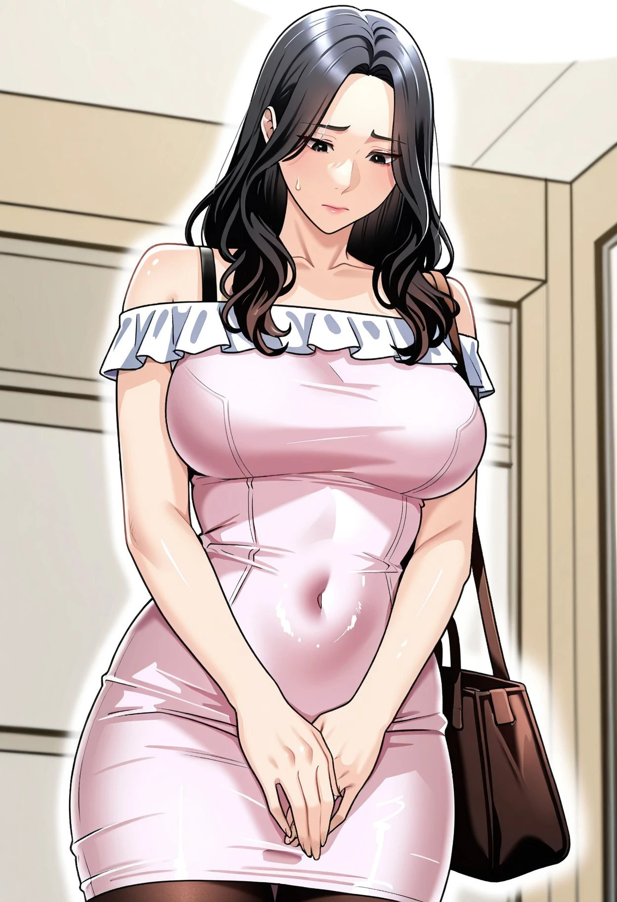 Date_outfit, light pink dress, fitted minidress, off shoulders, black shoulder straps, white frills at neckline, sheer pantyhose, dark brown shoulder bag, bag on right shoulder,  dark brown high heels boots,