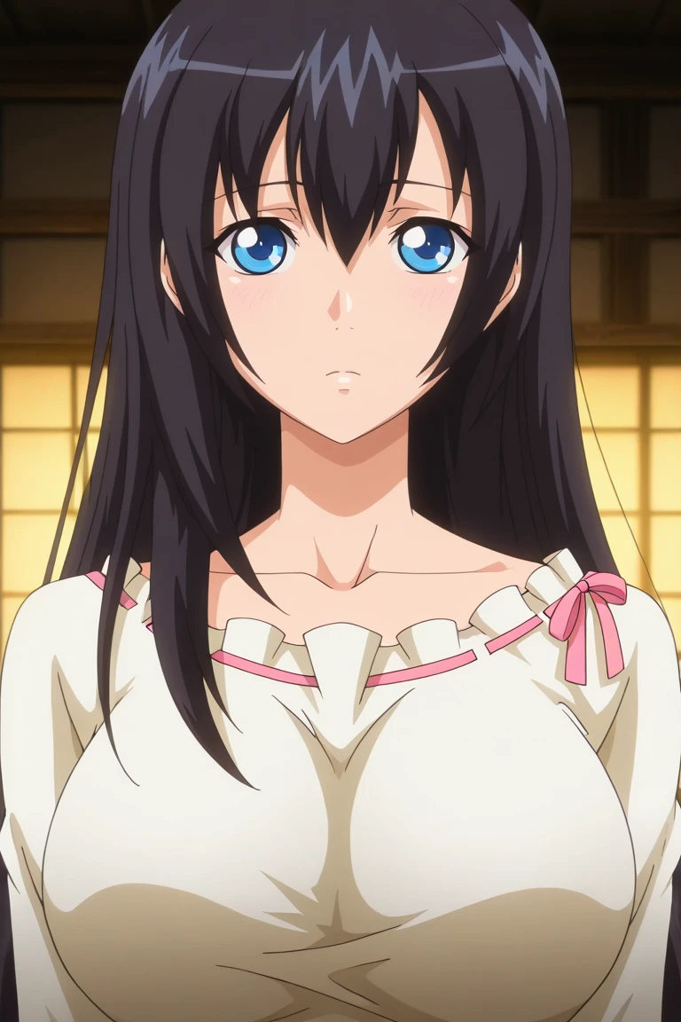 1girl, solo, Miu Kagami, black hair, long hair, blue eyes, cleavage, big , official_style