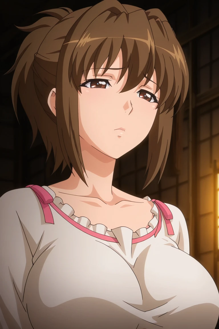 1girl, solo, Sayoko Kagami, brown hair, brown eyes, short hair, cleavage, big , official_style