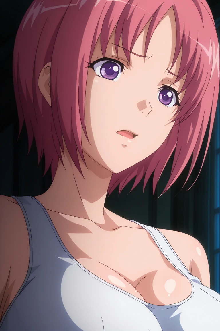 1girl, solo, Haruka Kagami, short hair, pink hair, purple eyes, big breast, official_style