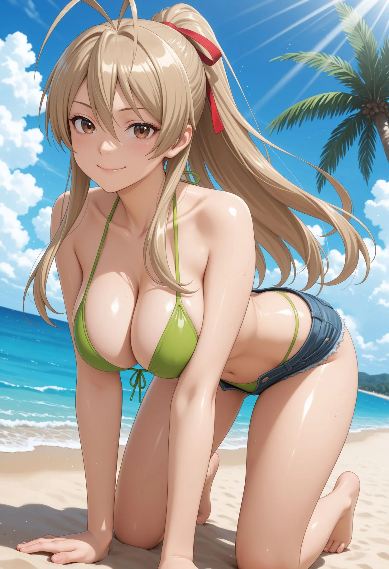 Main Prompt: 1girl, solo, curvy, very long hair, light brown hair, antenna hair, hair between eyes, brown eyes, ponytail, large breasts, narrow waist, wide hips,