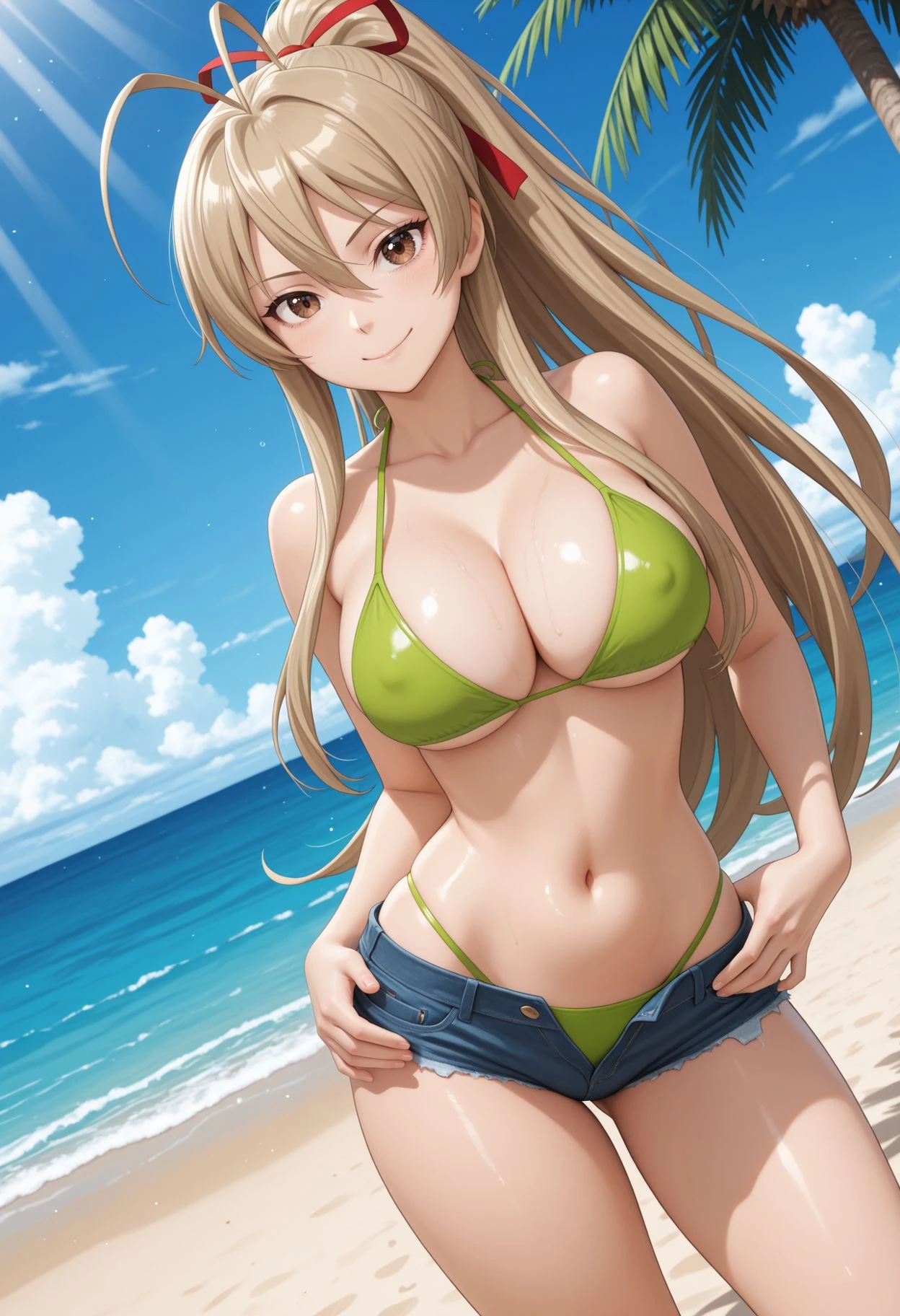 Swimsuit: swimsuit_rei, red hair ribbon, green bikini, halterneck bikini top, collarbone, cleavage, navel, midriff, highleg bikini bottom, denim shorts, micro shorts, bare legs,