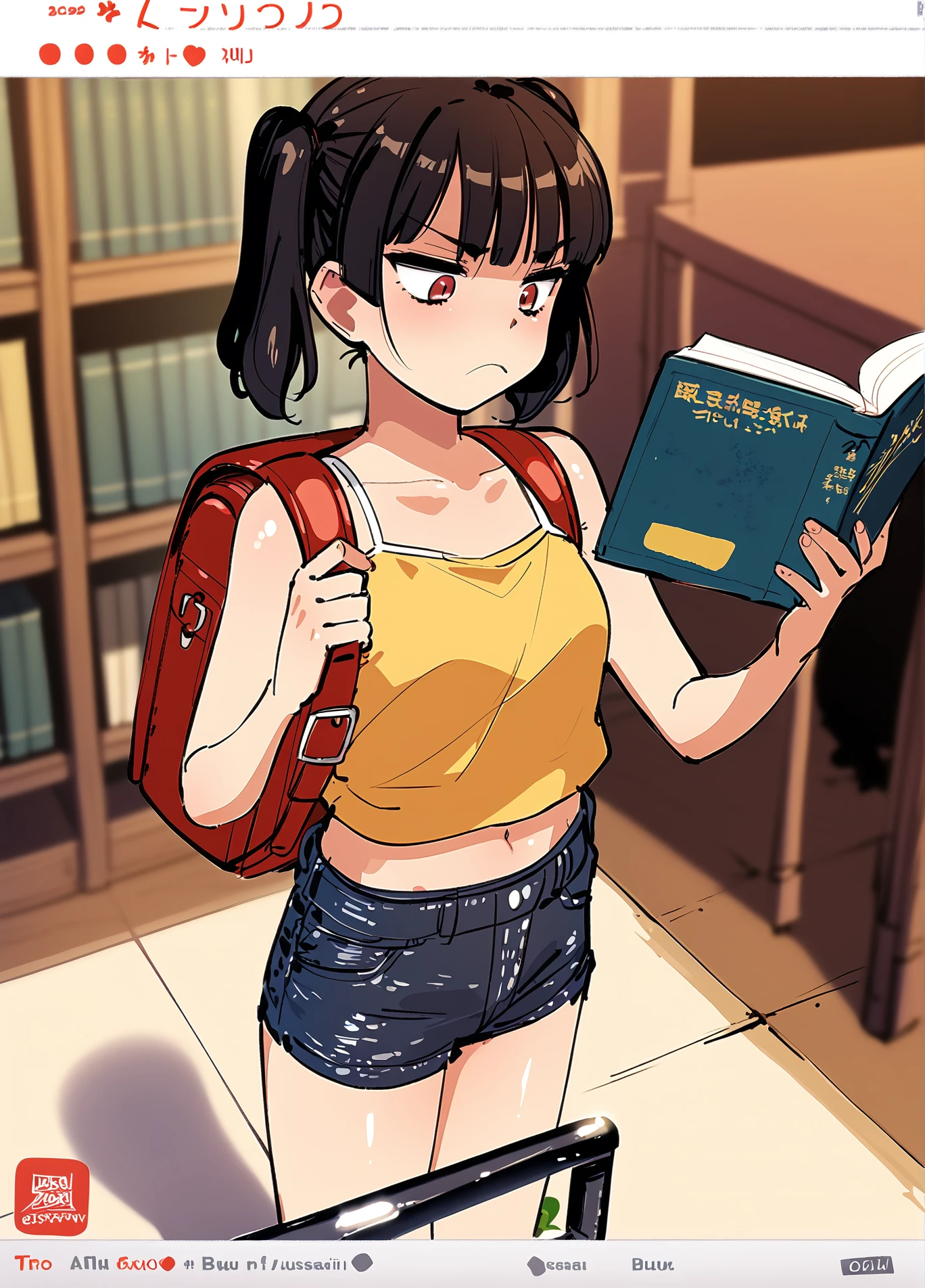 Trigger Words: sasaki kanna \(kaedeko\), short twintails, yellow crop top, spaghetti strap, denim shorts