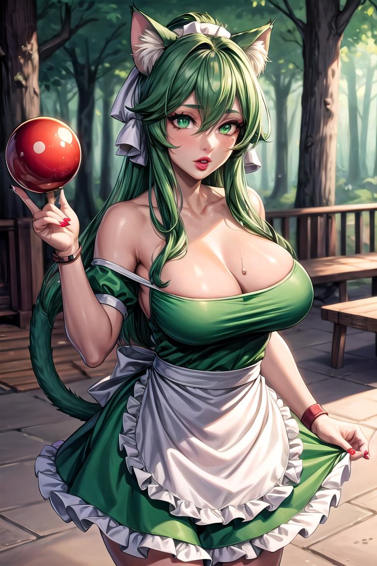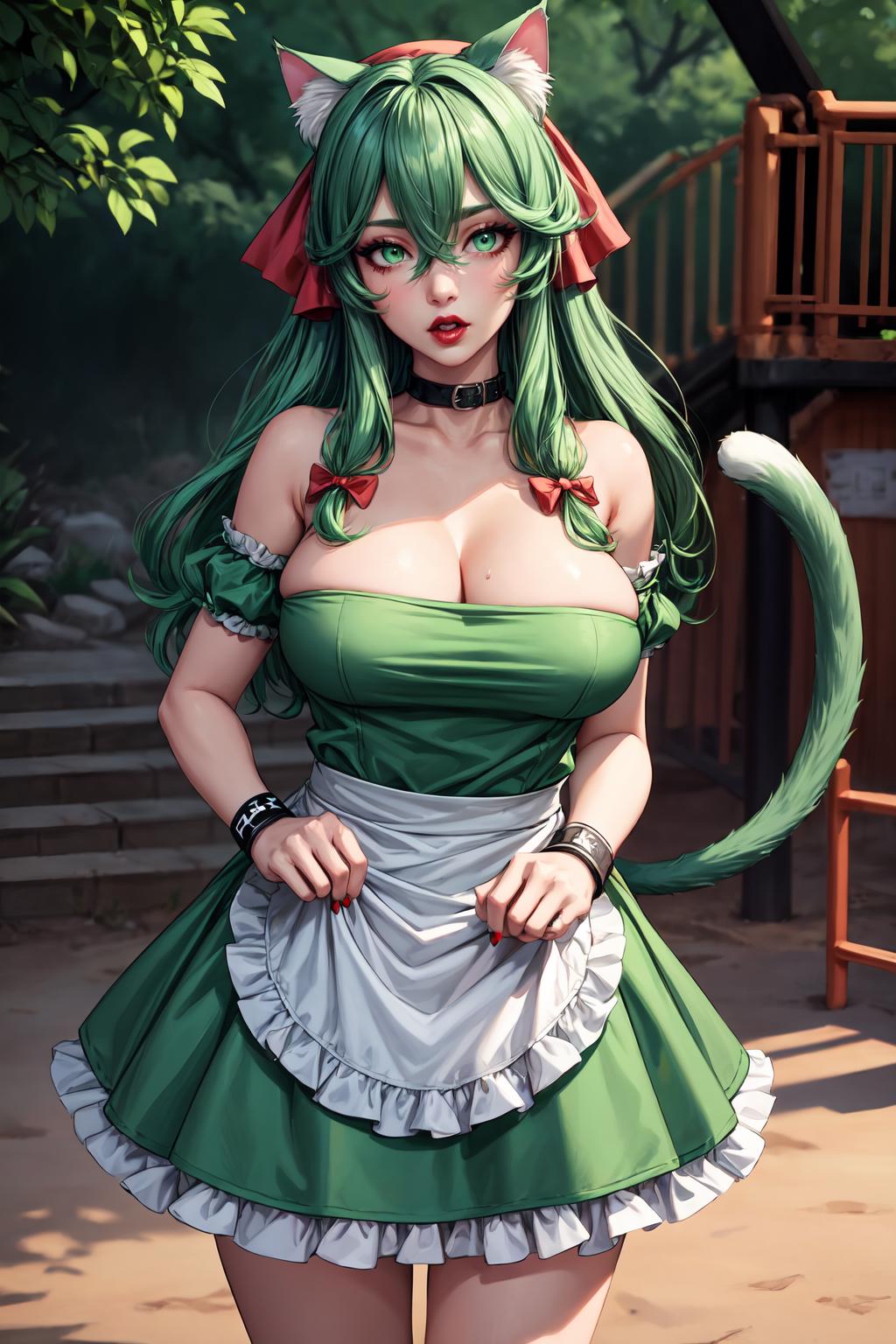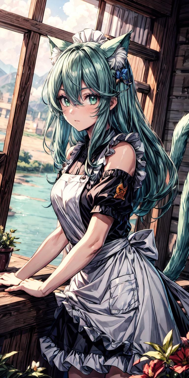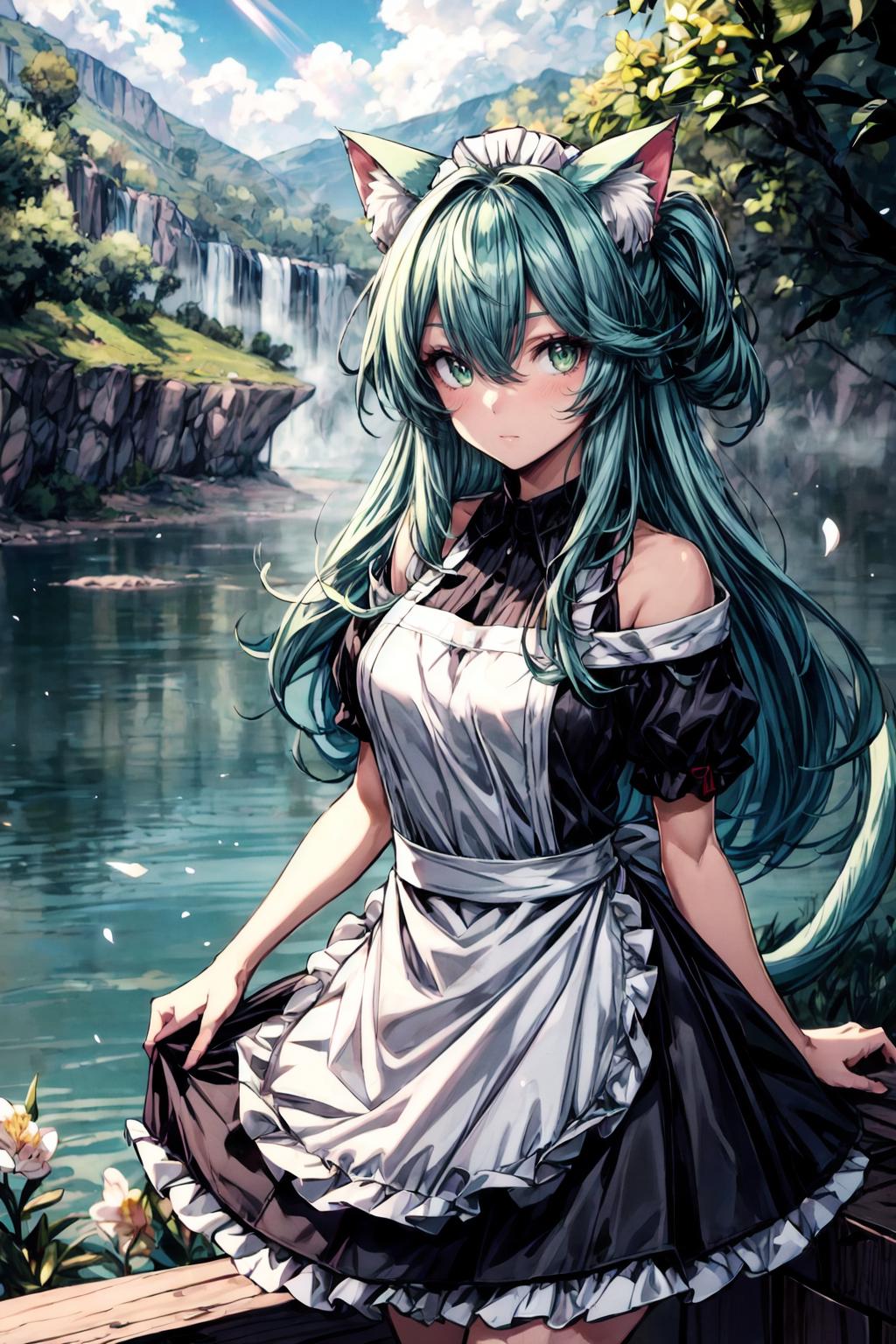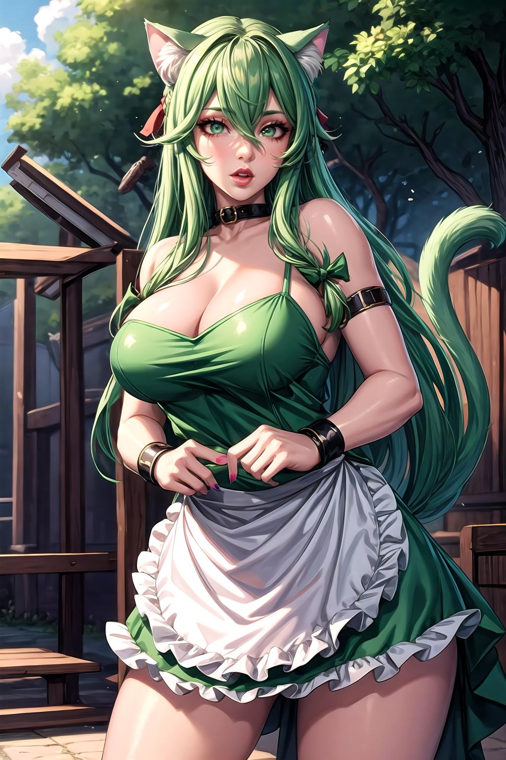 animal ears,tail,cat ears,long hair,green eyes,apron,dress, green hair,name tag,hair between eyes,bare shoulders,short sleeves,frills,waist apron,sidelocks