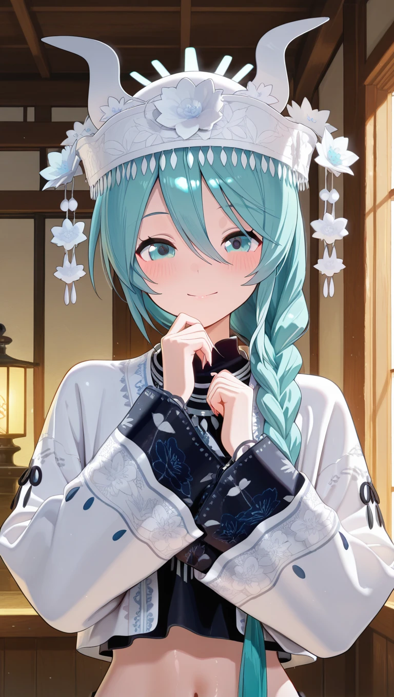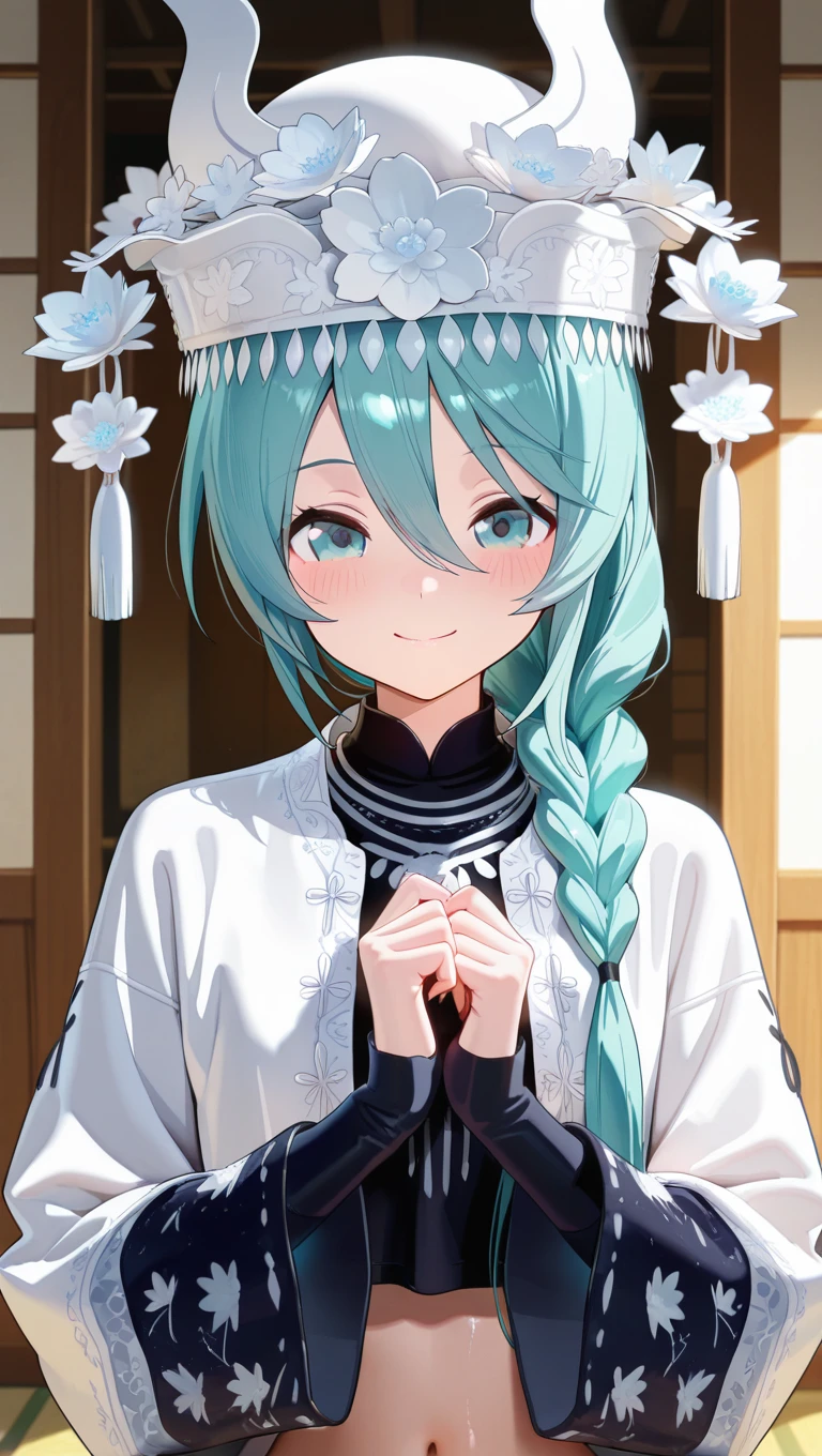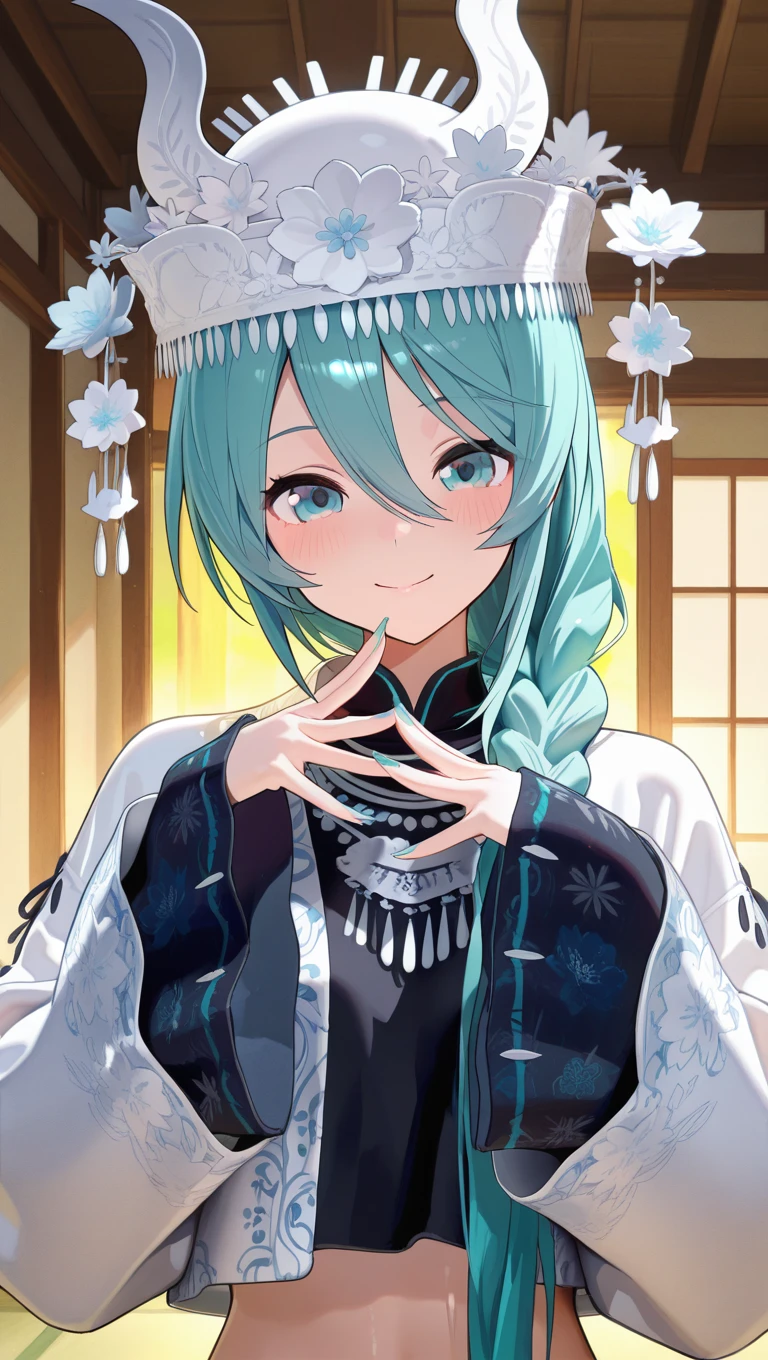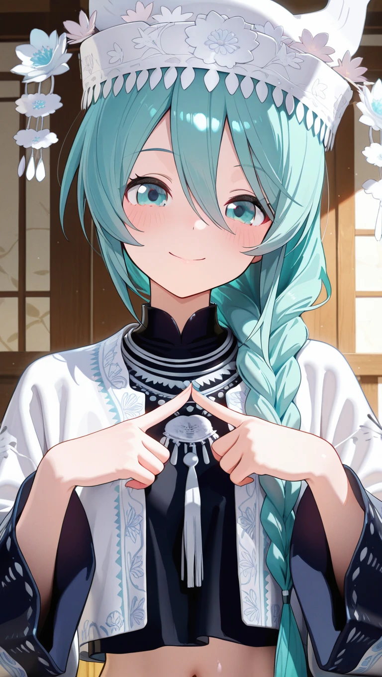 hat,white headwear,very long hair,aqua hair,single braid,hair over shoulder,hair between eyes,aqua eyes