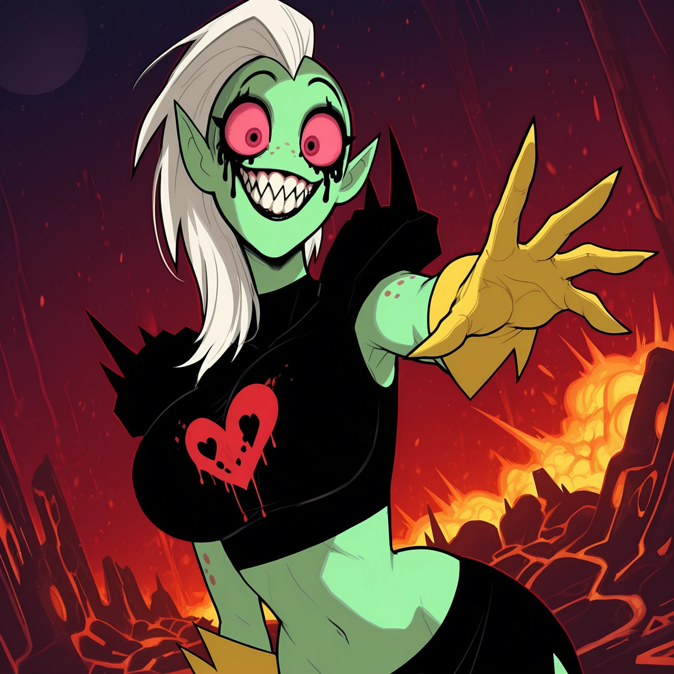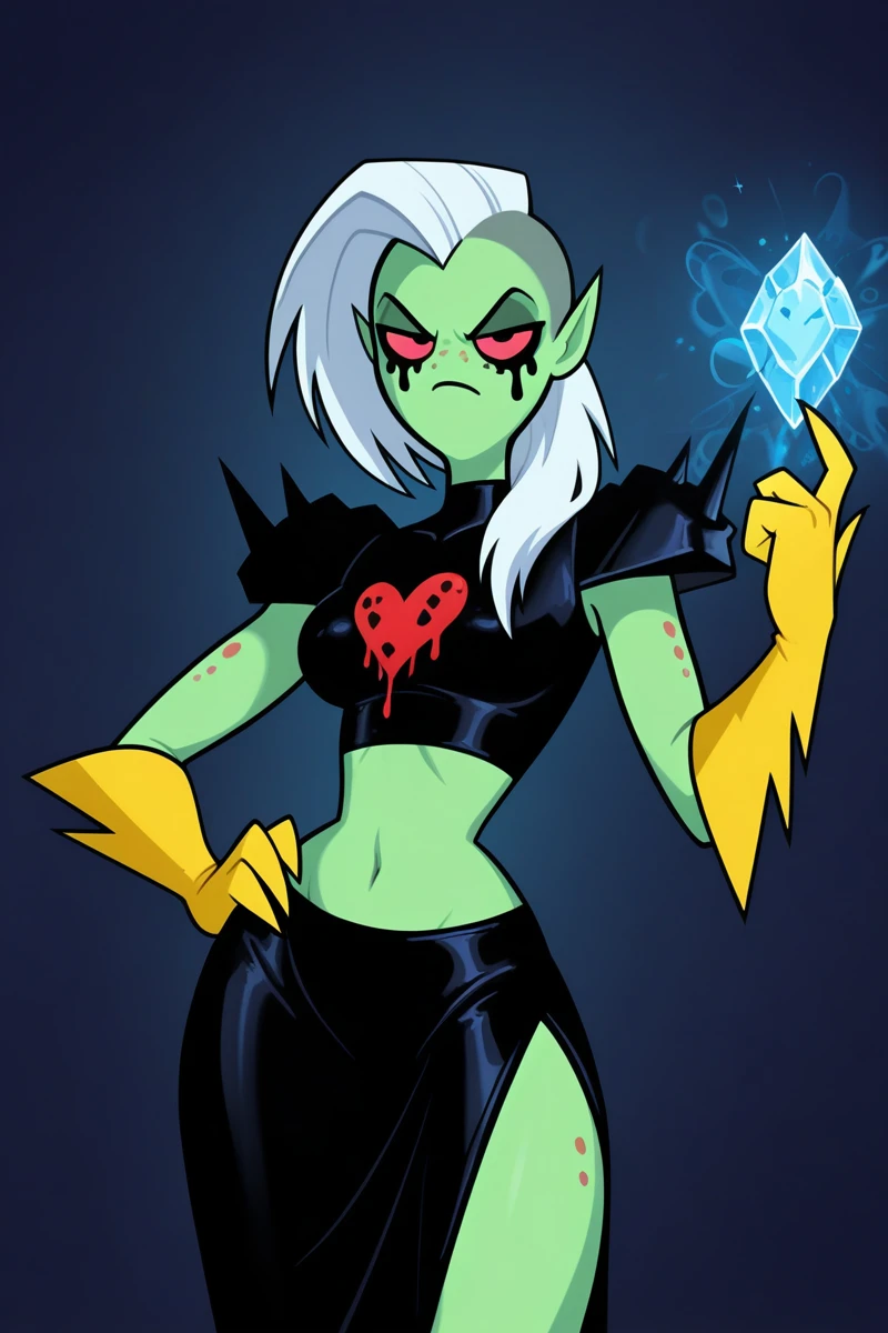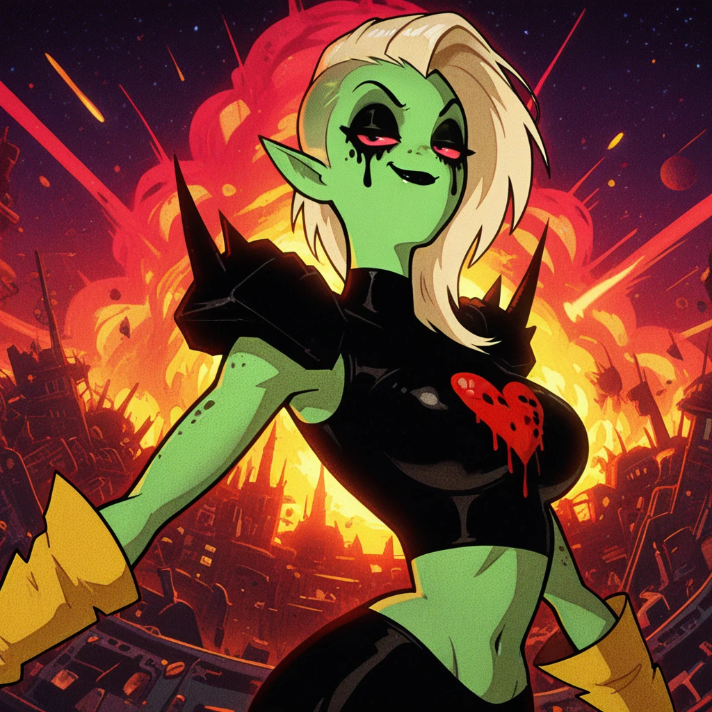 L0RD_D0M1N4T0R, solo, 1girl, freckles, alien humanoid, lord dominator, female, solo, yellow gloves, green skin, white hair, pink sclera, ruined makeup, noseless, black lips, slim, helmet, horned helmet, hair on shoulder, spikes, black crop top, sleeveless, black dress, slit dress, heart print, midriff, navel, shoulder pads, yellow gloves, socks, sneakers,