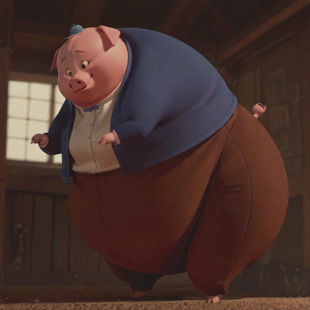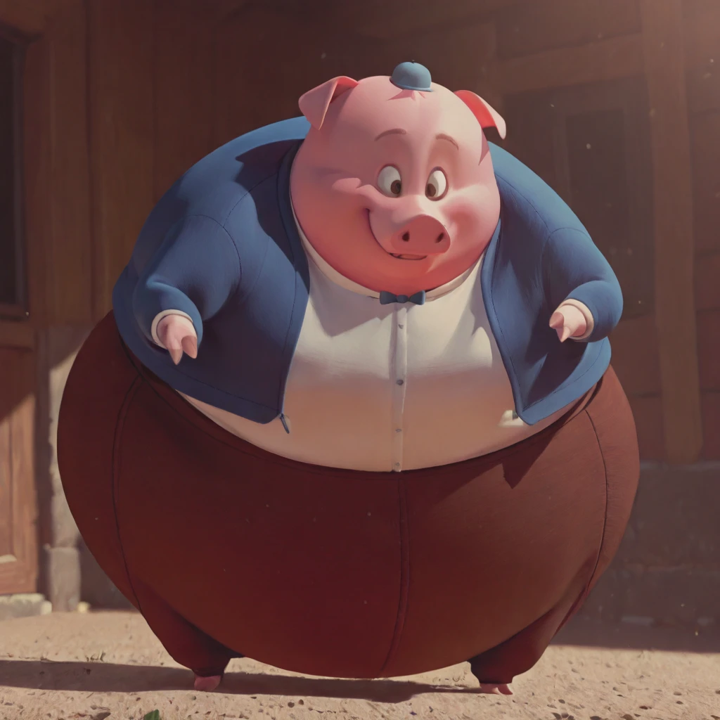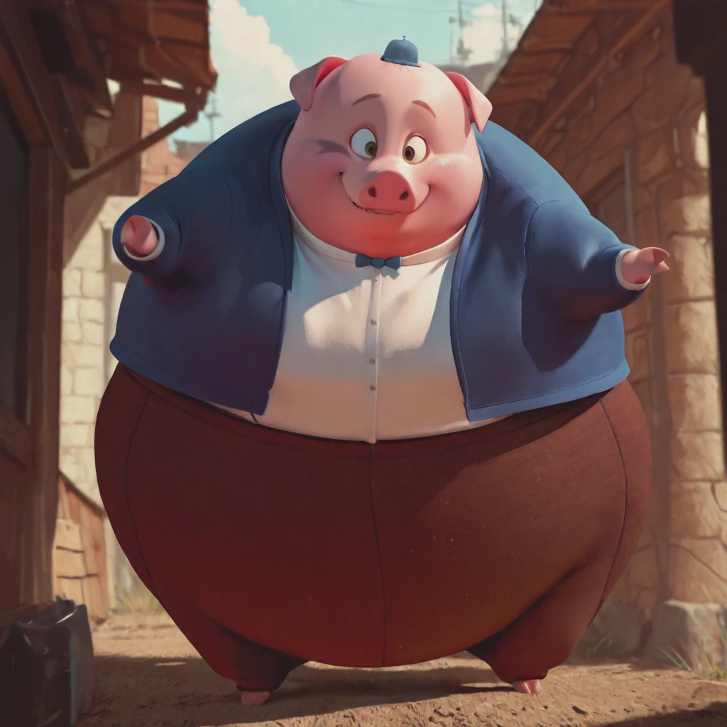 runtofthelitter_il, pig, male, pink skin, obese, brown eyes, brown eyebrows, small limbs, hat, bowtie, shirt, blue jacket, brown pants, spandex pants