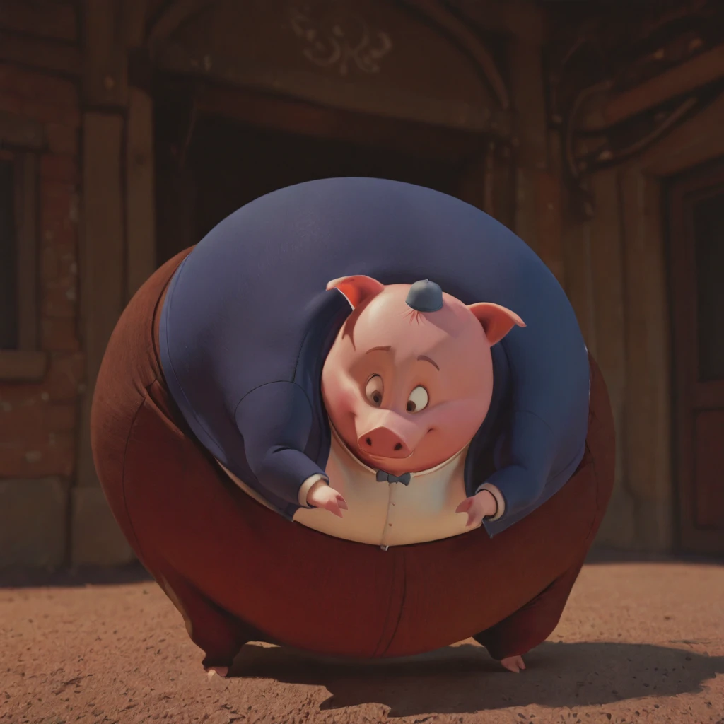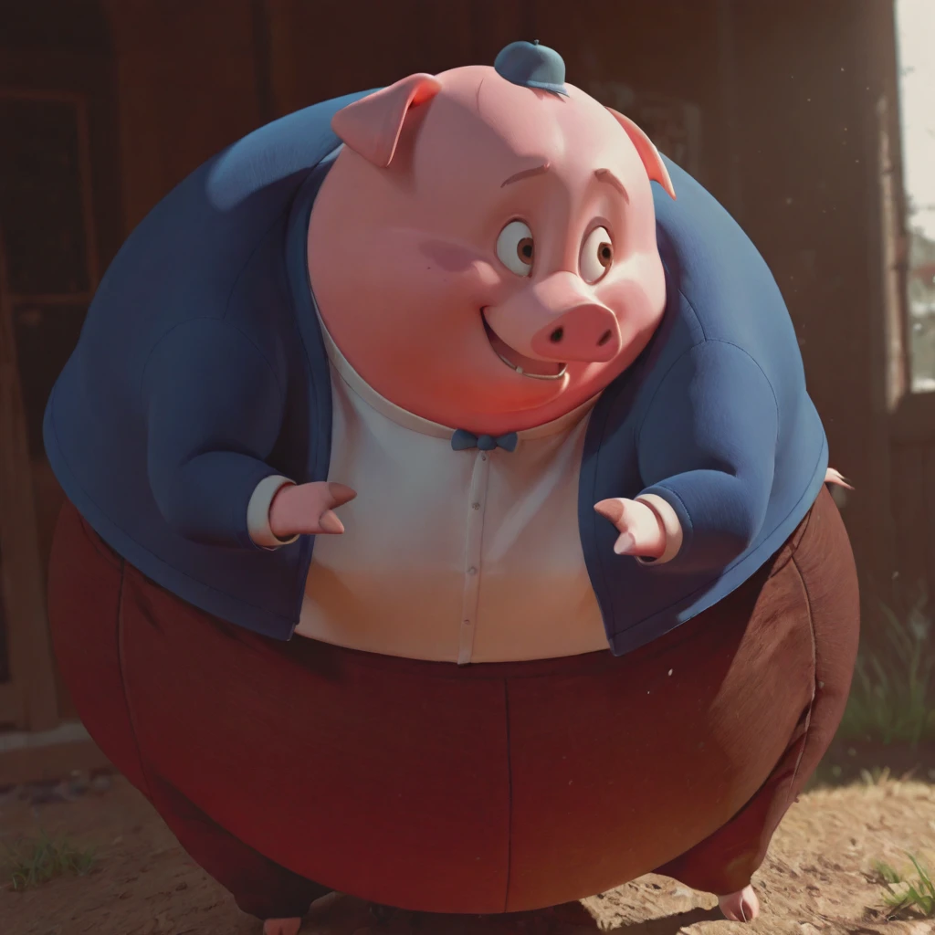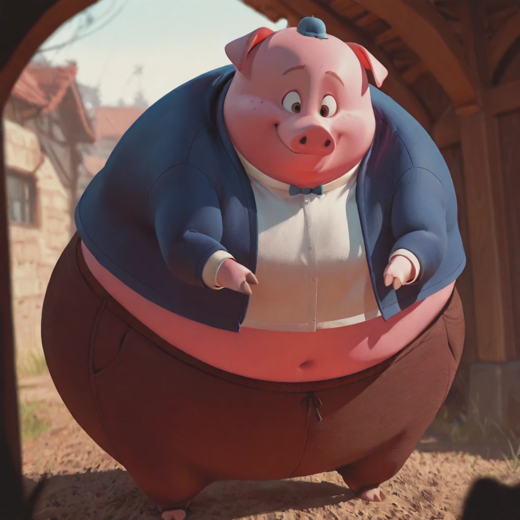 runtofthelitter_il, pig, male, pink skin, obese, brown eyes, brown eyebrows, small limbs, hat, bowtie, shirt, blue jacket, brown pants, spandex pants