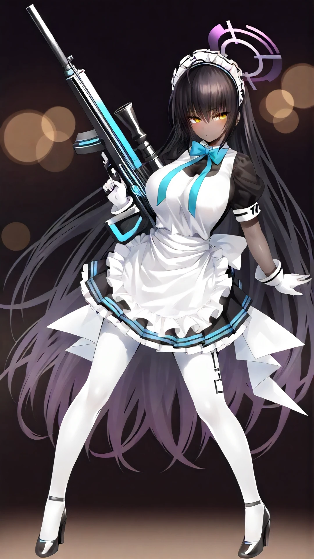 karin_blue_archive, an anime girl, 1girl, solo, long hair, breasts, looking at viewer, bangs, large breasts, black hair, gloves, white background, holding, very long hair, full body, yellow eyes, short sleeves, pantyhose, white gloves, dark skin, apron, high heels, dark-skinned female, gun, maid, maid headdress, halo, rifle, maid apron, white pantyhose