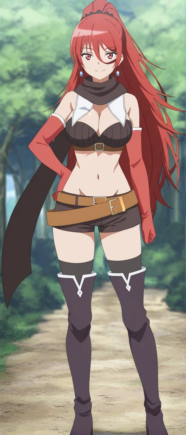 anime coloring, black scarf, white collar, cleavage, black top, brown belts, red gloves, elbow gloves, stomach, navel, short shorts, black shorts, black thighhighs, boots, black boots