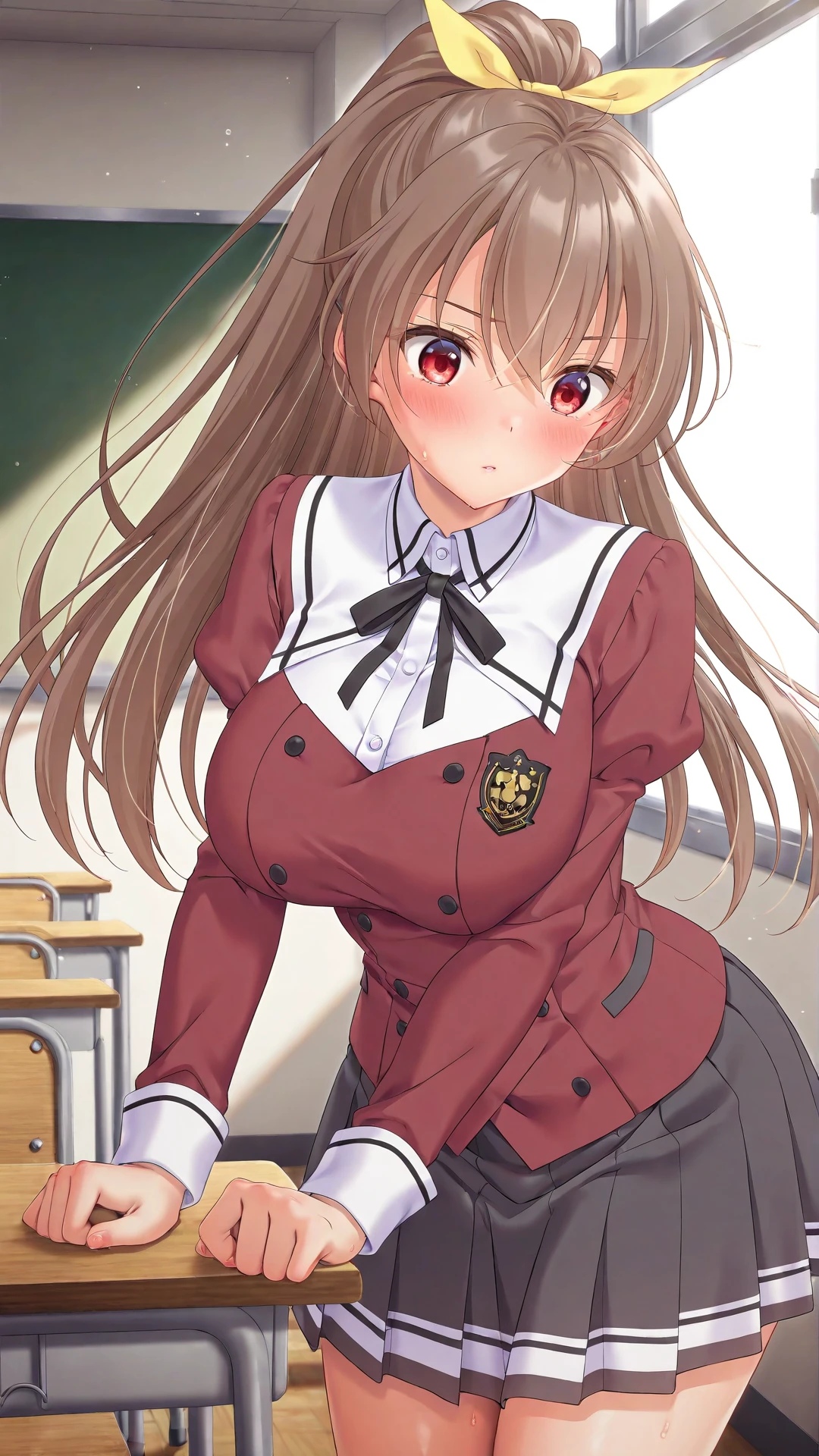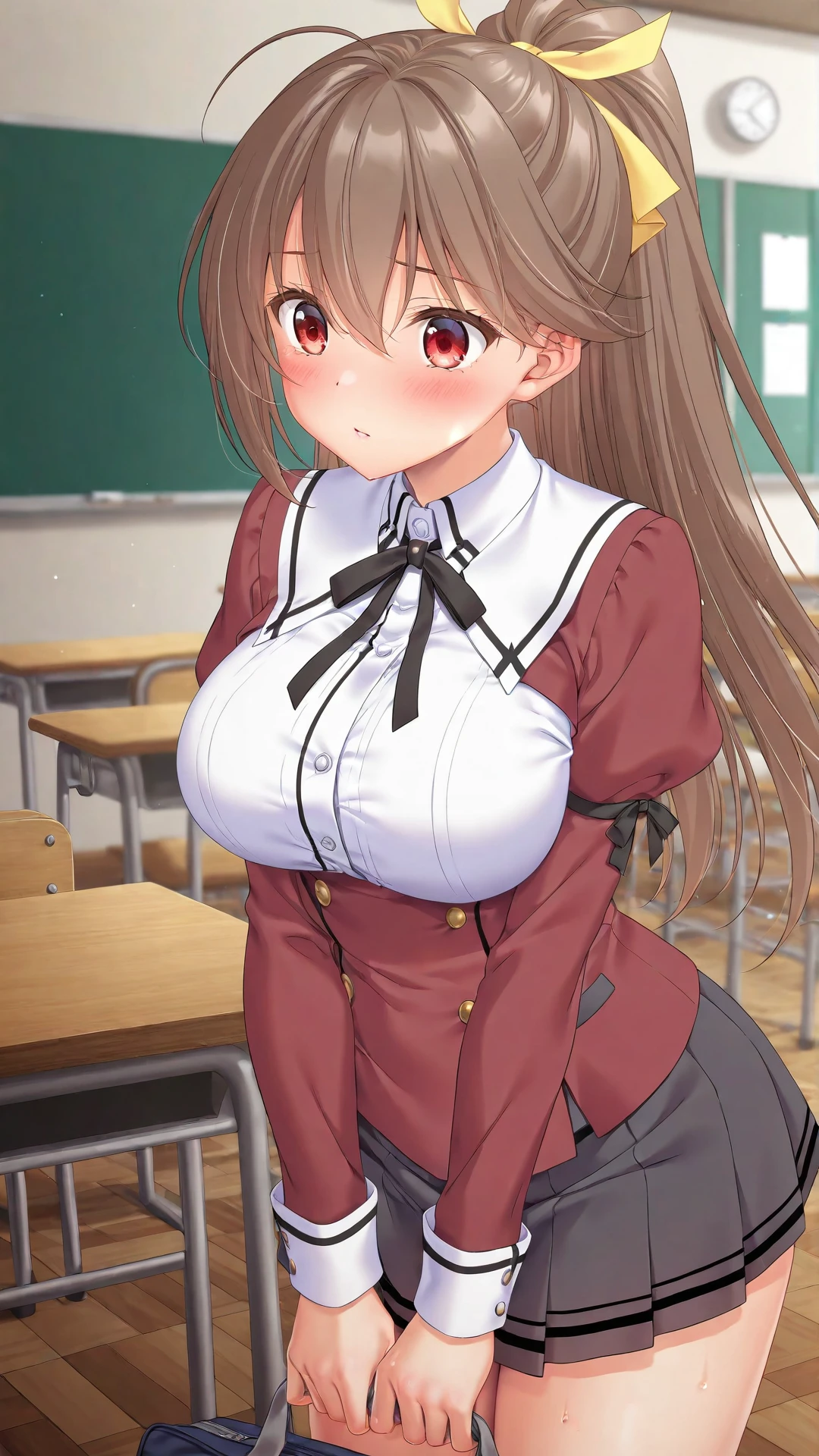 ,Katou Takako,1girl,solo,brown hair,ponytail,long hair,red eyes,,,ribbon,hair ribbon,long sleeves,skirt,school uniform,