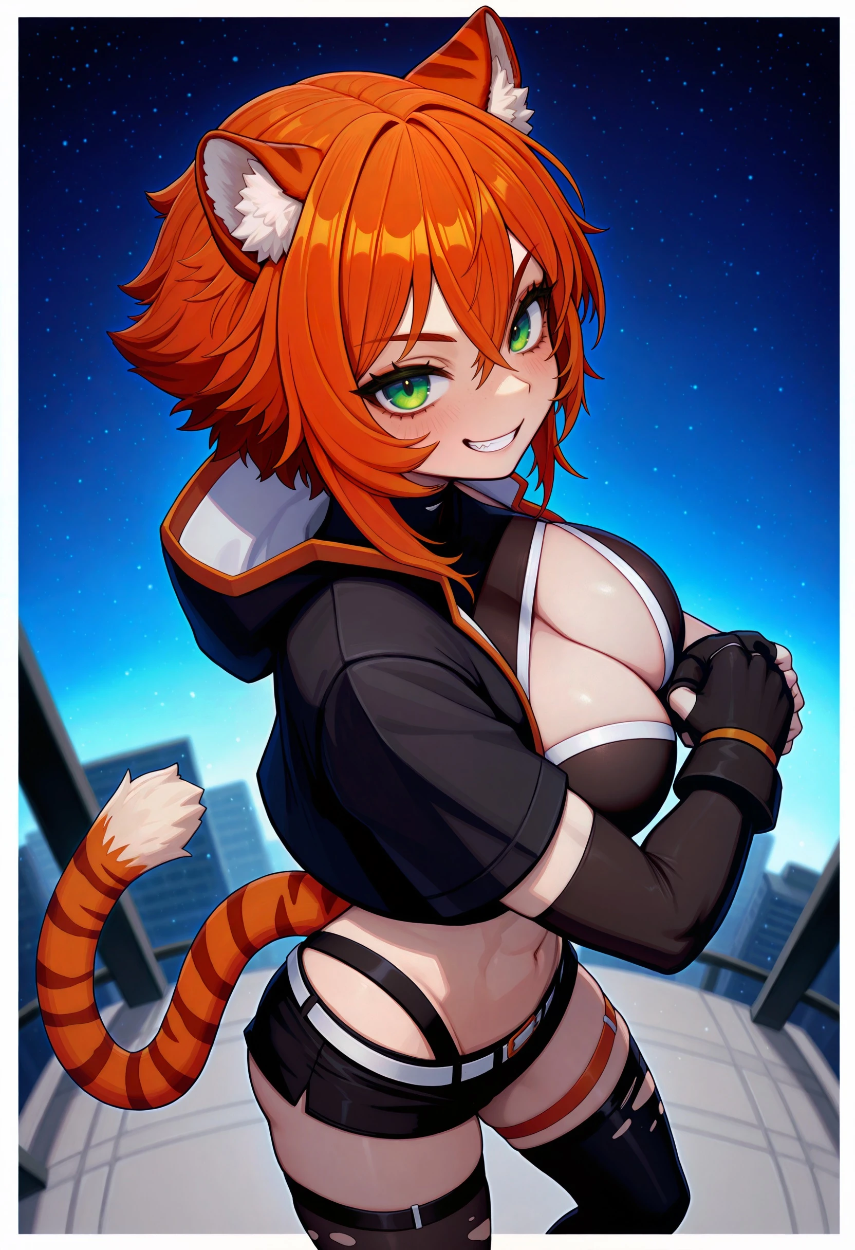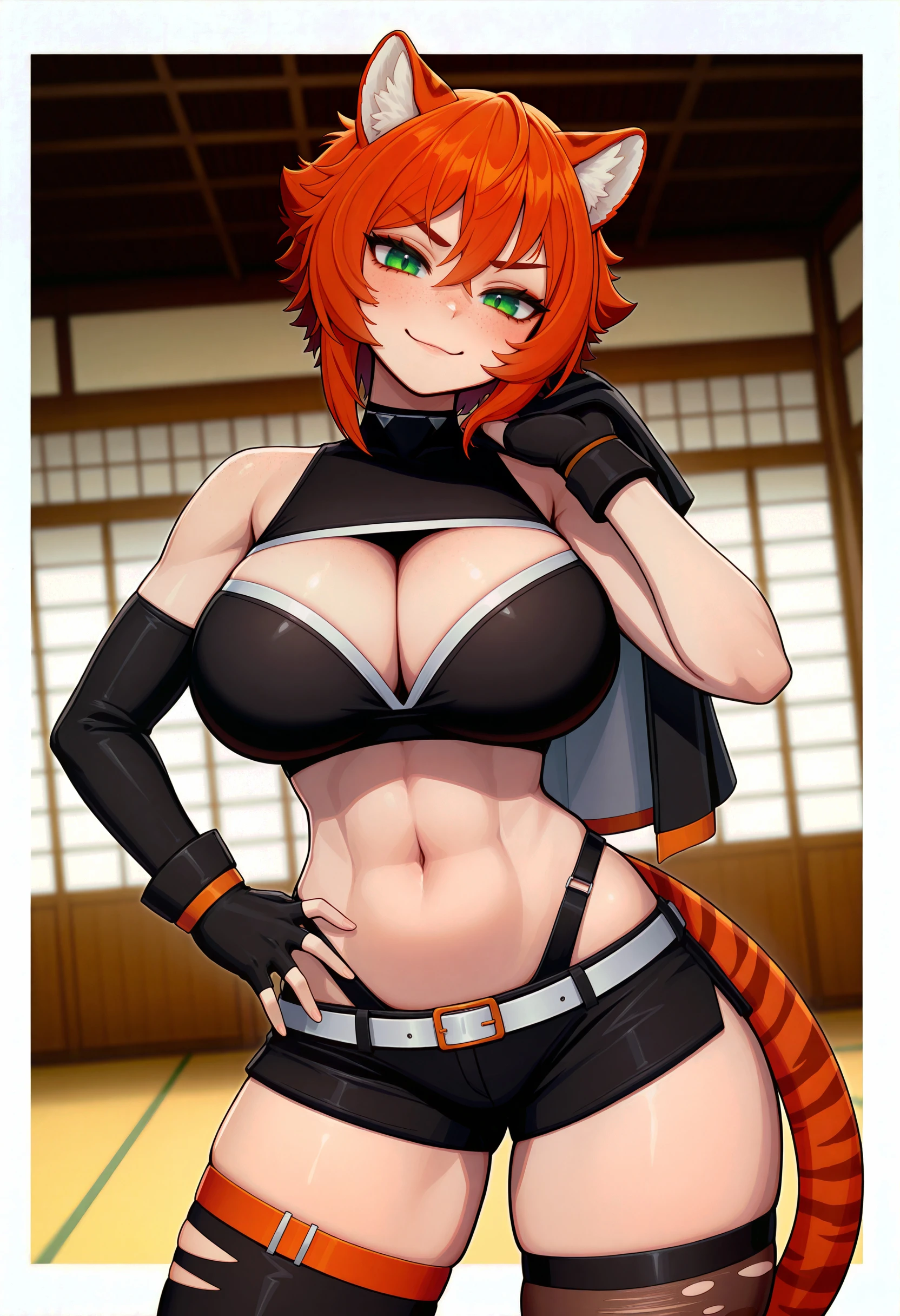 toned female, tiger girl, tiger ears, tail, freckles, green eyes, orange hair,