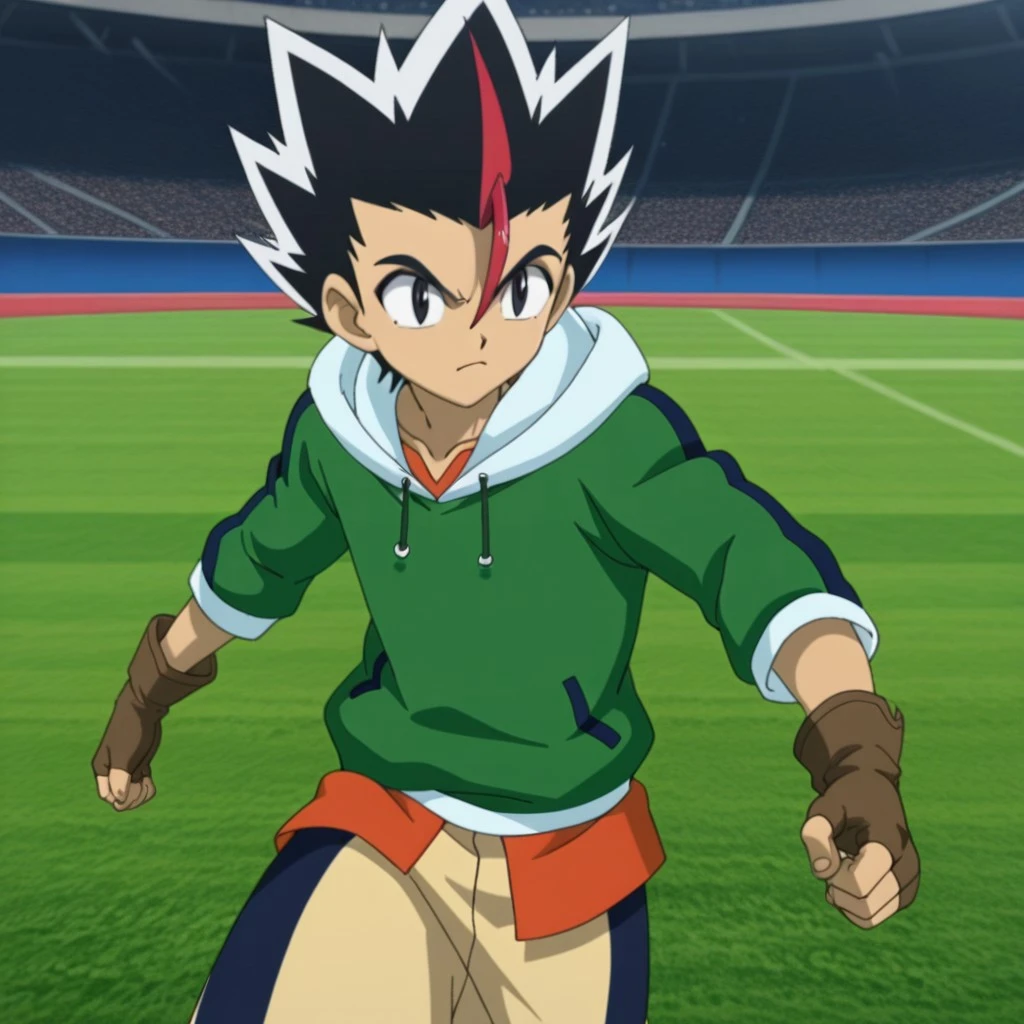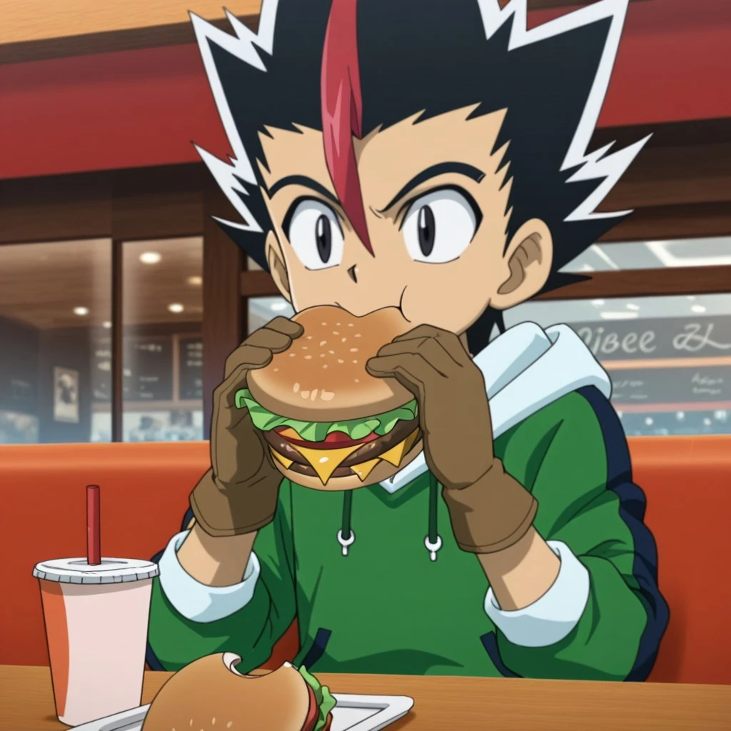 1boy, solo, masamune, gloves, black hair, multicolored hair, hoodie, spiked hair, hood, brown gloves, fingerless gloves, black eyes, two-tone hair, red ahoge
