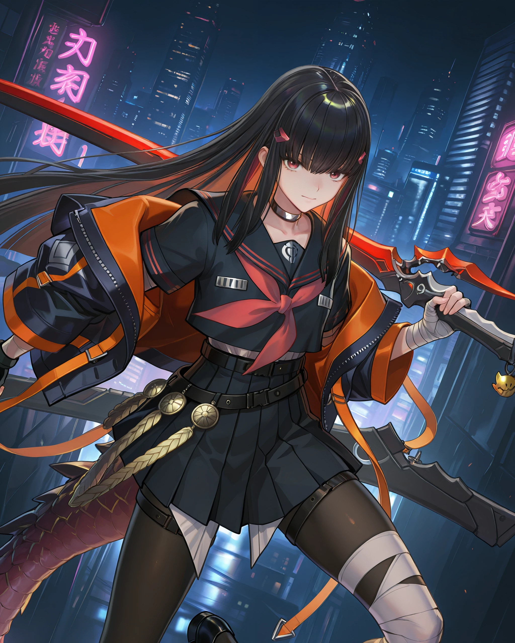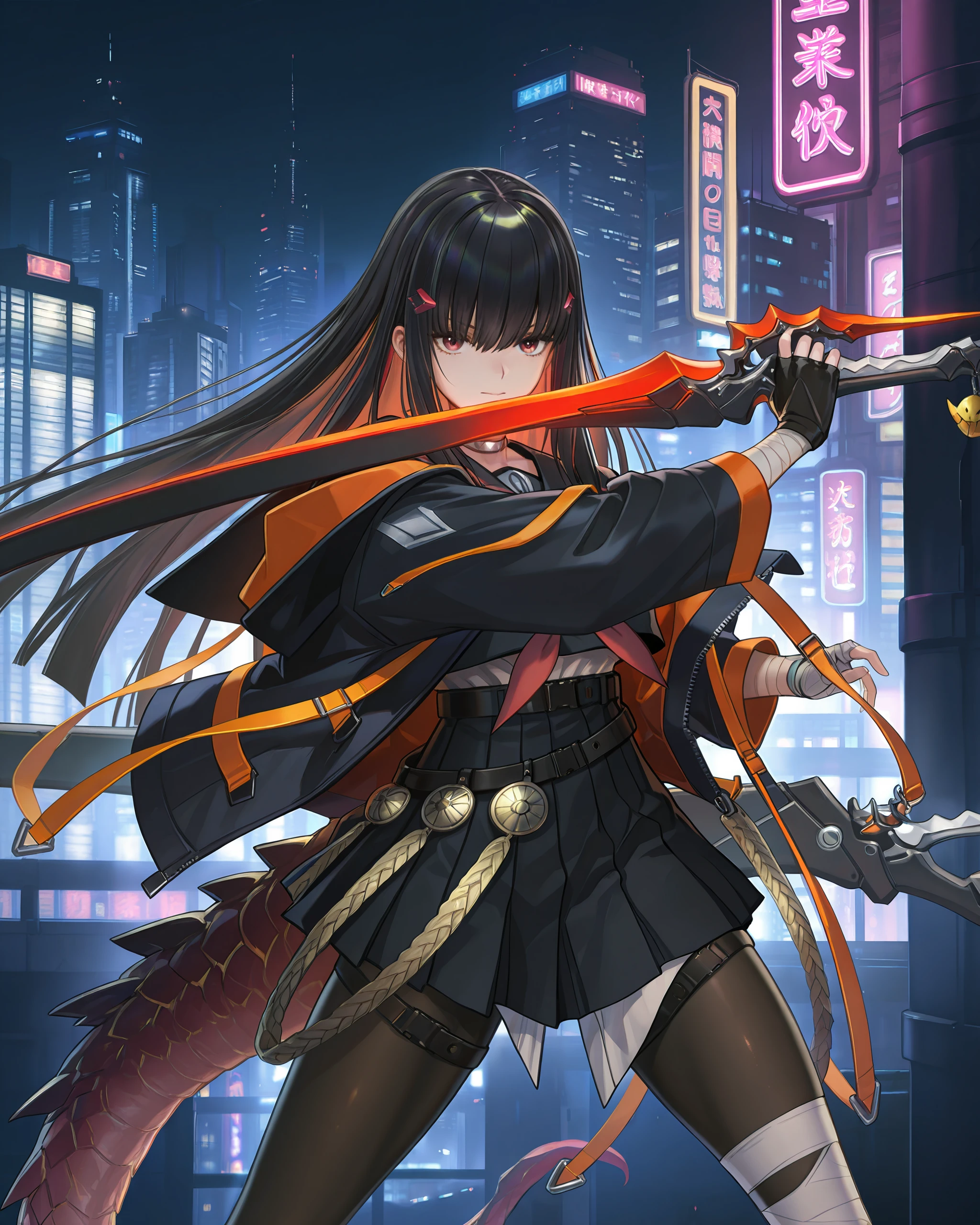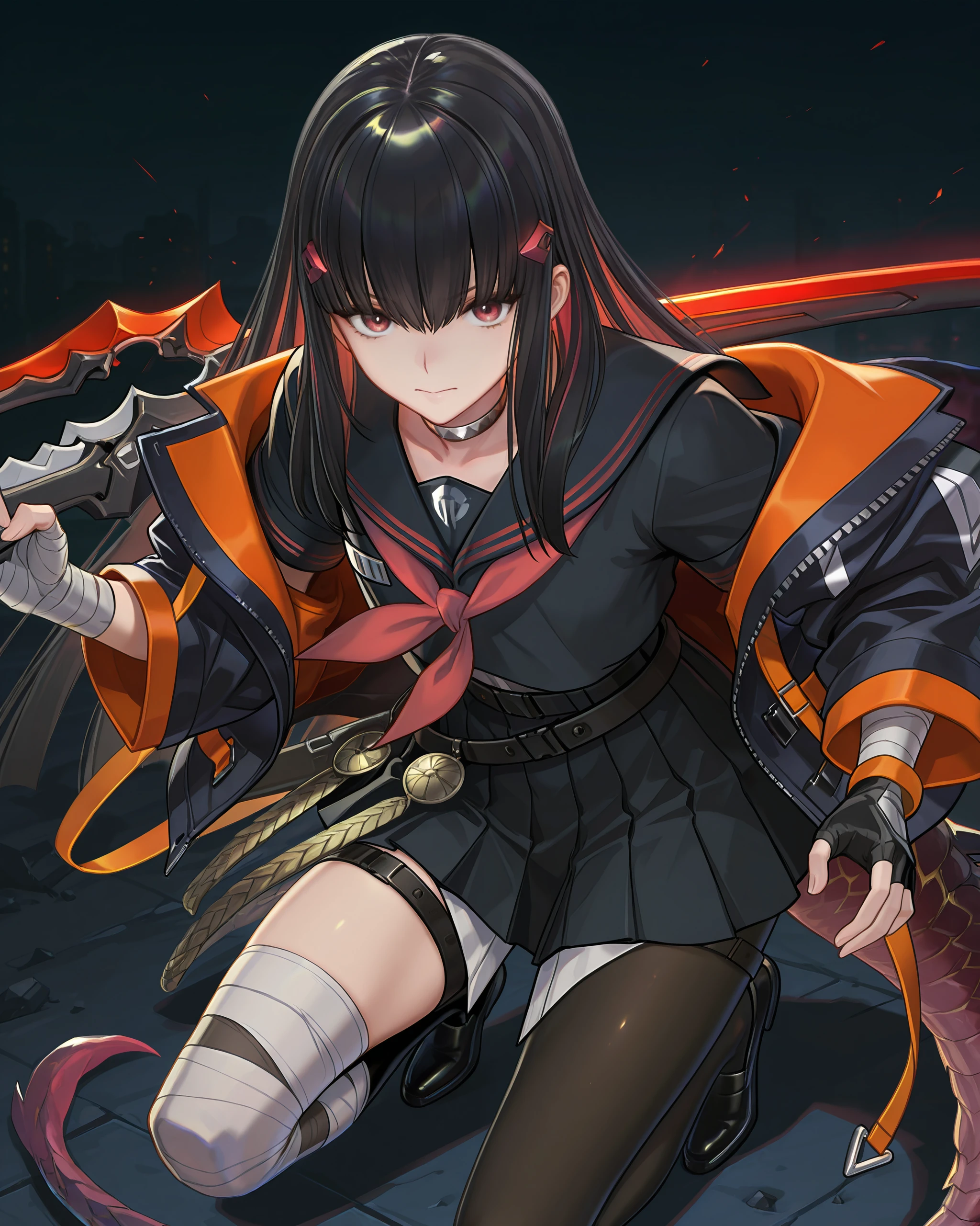 elsvwb, black hair, multicolored hair, hairclip, red eyes, choker, school uniform, black serafuku, black pantyhose, asymmetrical gloves, single fingerless glove, open jacket, bandaged arm, single leg bandage, red neckerchief, pleated skirt,black footwear, dragon tail, bandages, katana, sheathed for addition