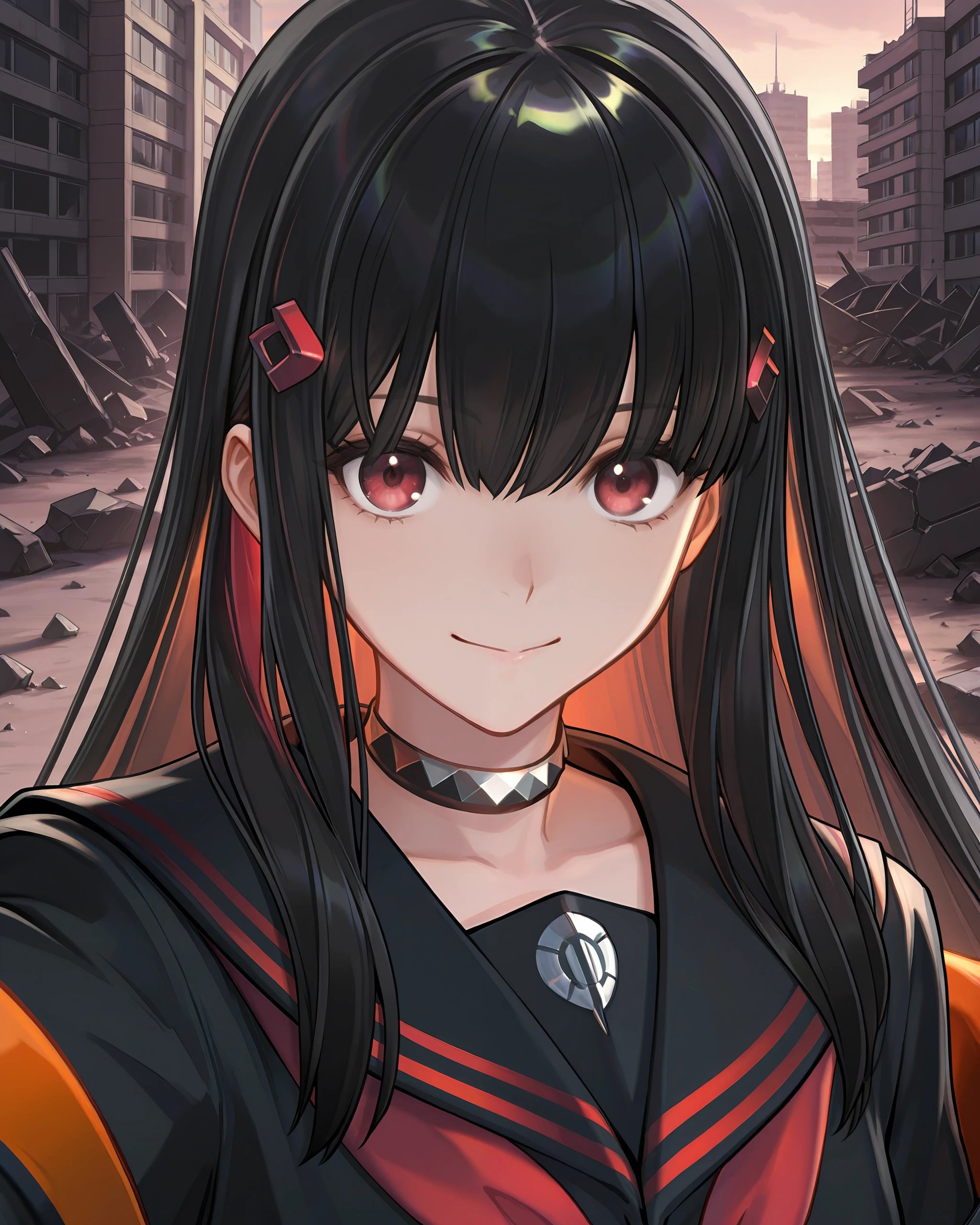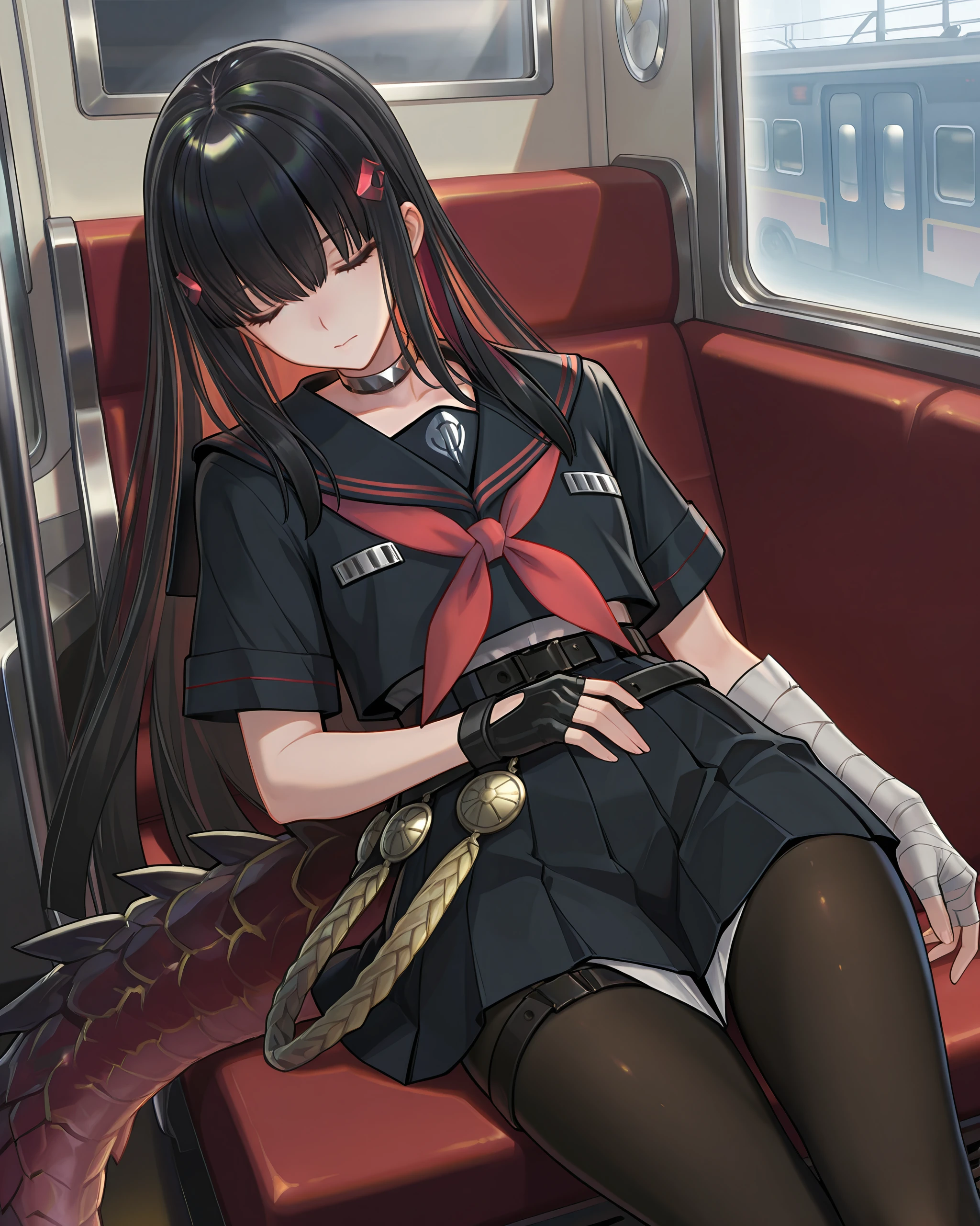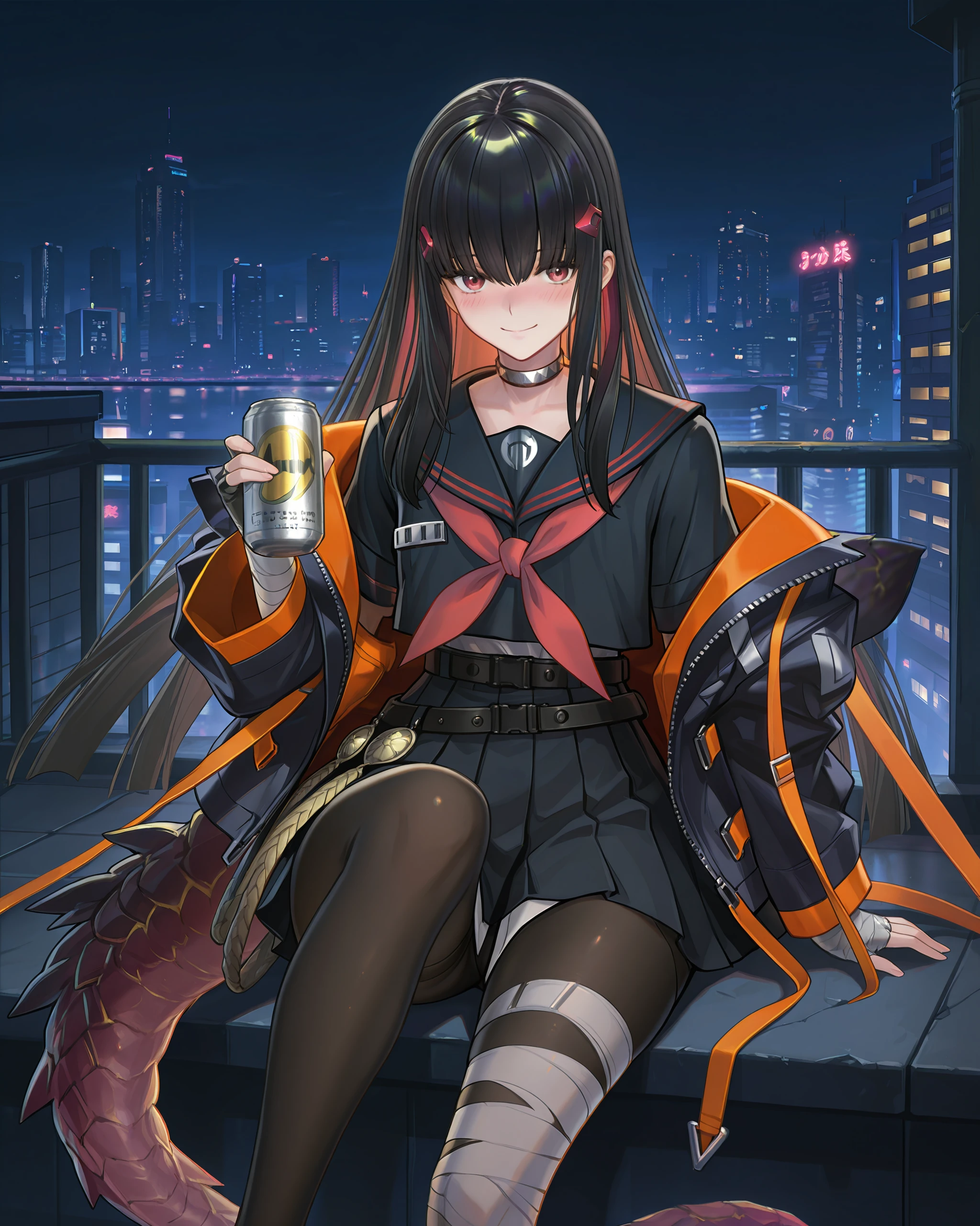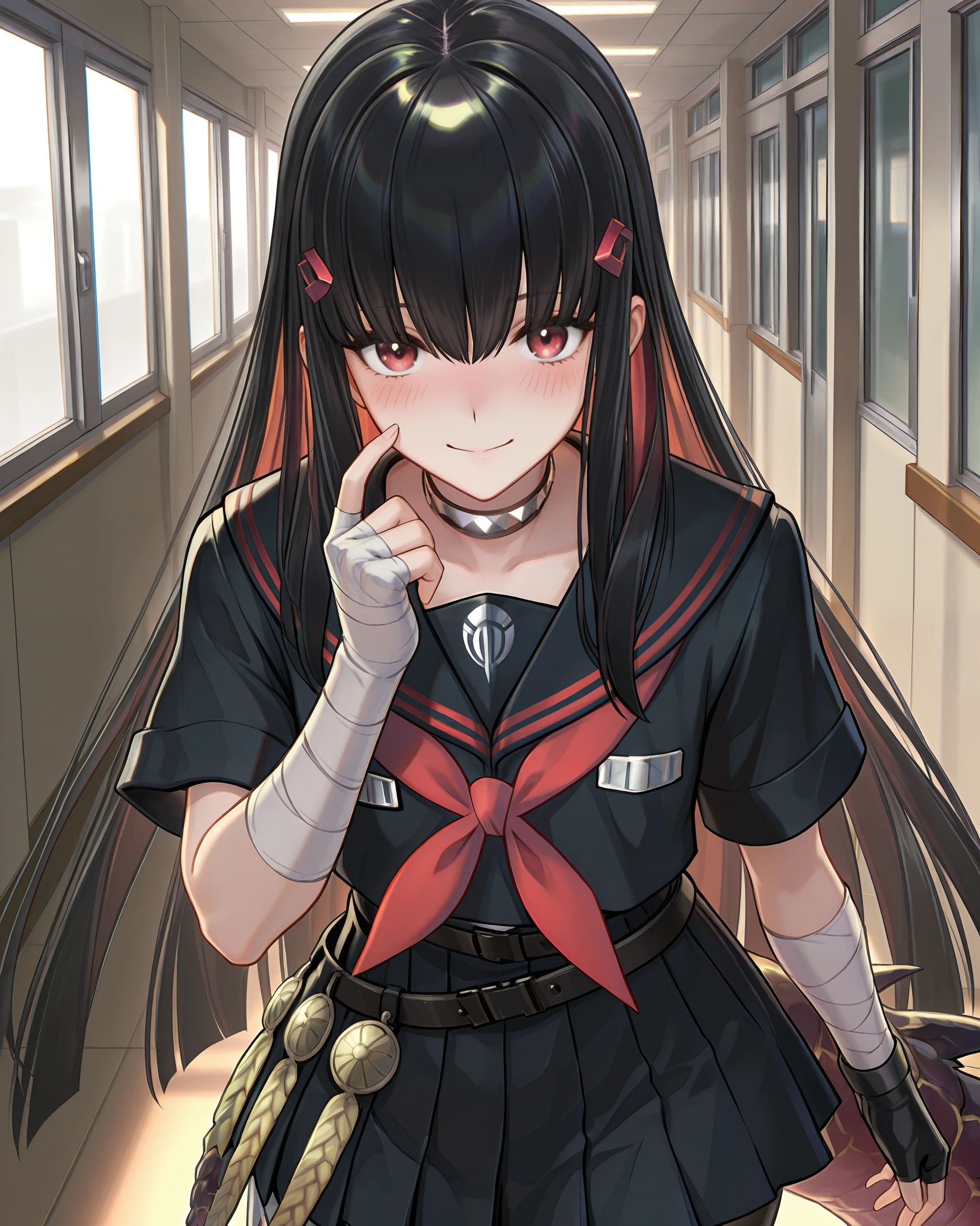 elsvwb, black hair, multicolored hair, hairclip, red eyes, choker, school uniform, black serafuku, black pantyhose, asymmetrical gloves, single fingerless glove, open jacket, bandaged arm, single leg bandage, red neckerchief, pleated skirt,black footwear, dragon tail, bandages