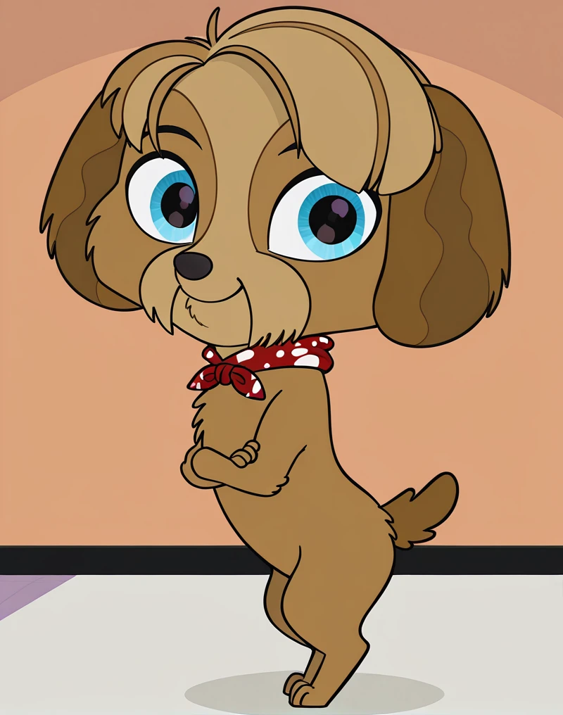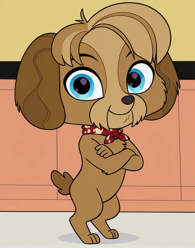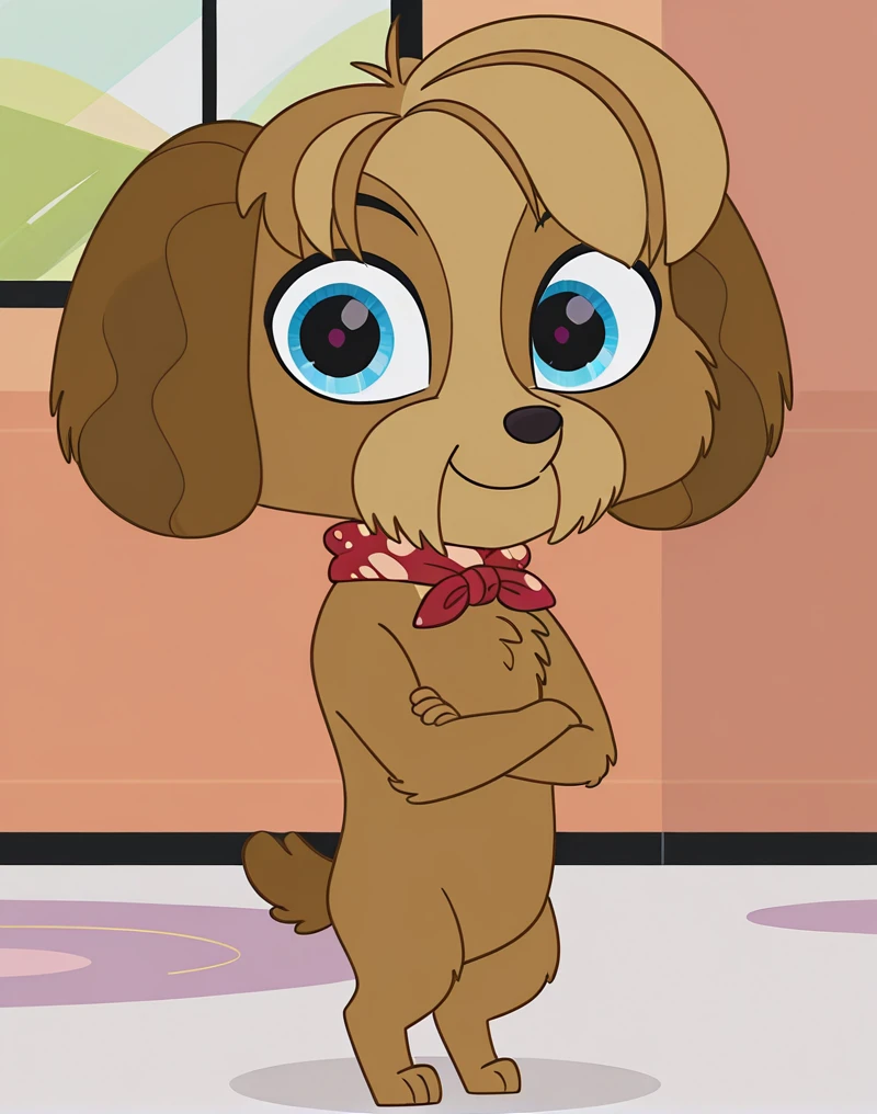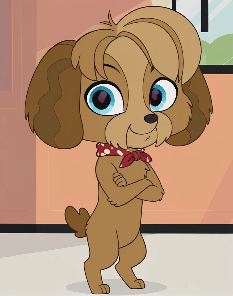 DigbyLPS, brown fur, dog, furry, furry male, 1boy, semi-anthro, brown hair, big ears, dog ears, dog tail, dog nose, black nose, cyan eyes, scarf, red scarf