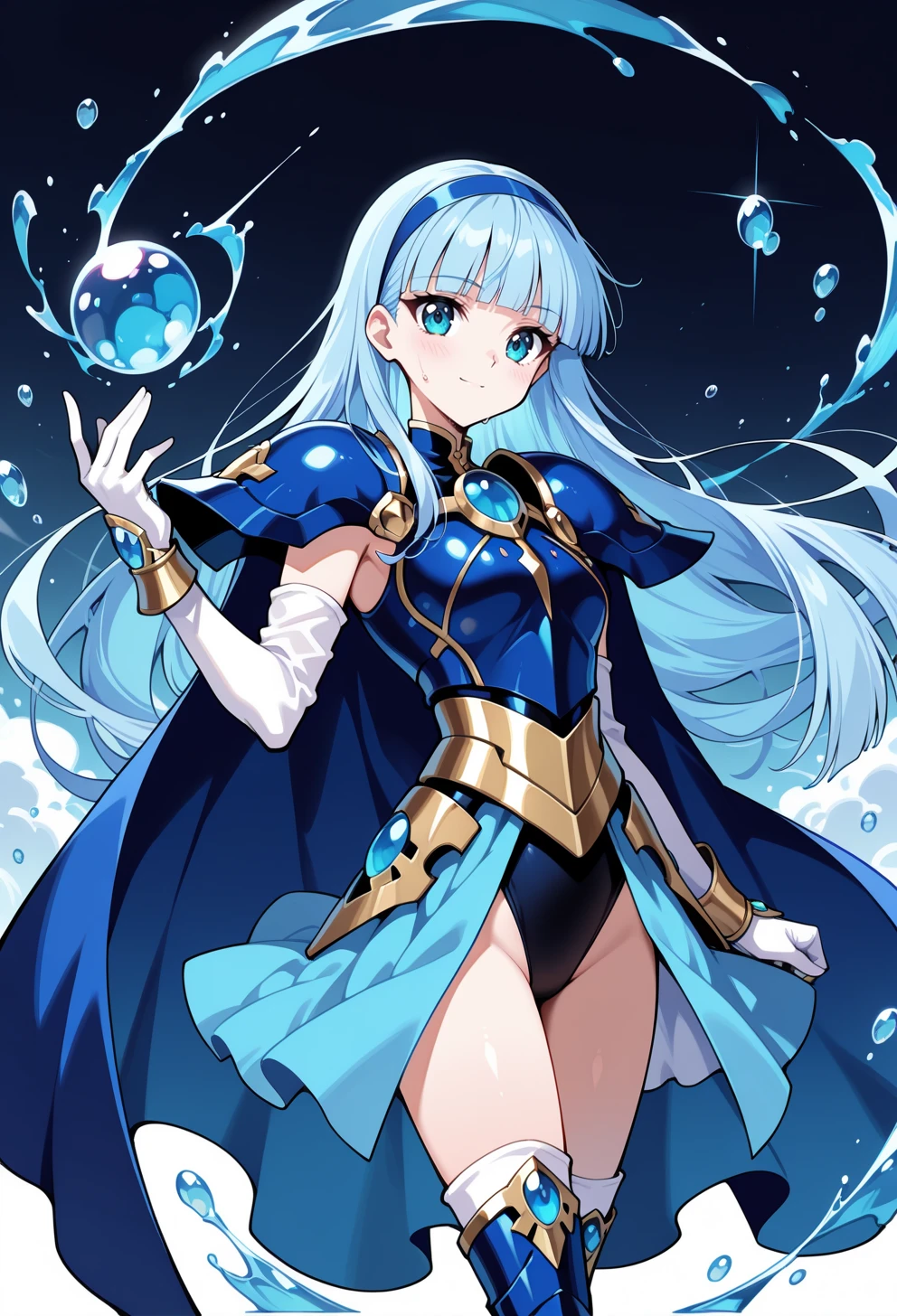 AEUmiFinal, blue eyes, blue hair, blunt bangs, long hair, blue hairband, armored dress, blue armor, blue cape, elbow gloves, white gloves, gem, pauldrons, thigh boots, leotard under clothes, showgirl skirt