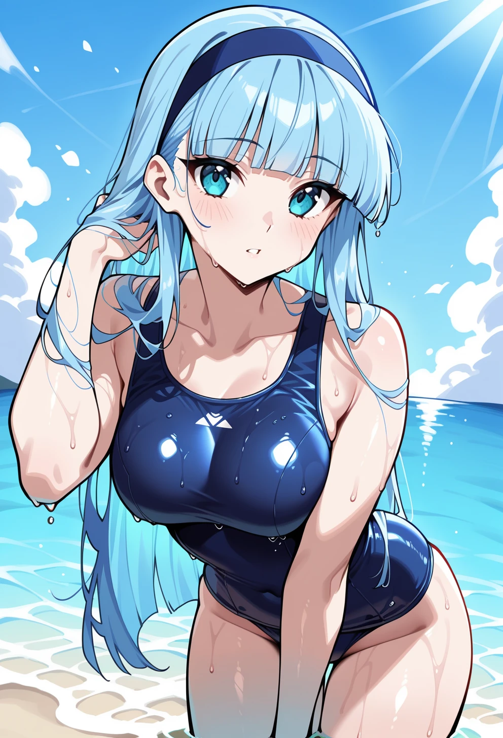 blue eyes, blue hair, blunt bangs, long hair, blue hairband, School Uniform: