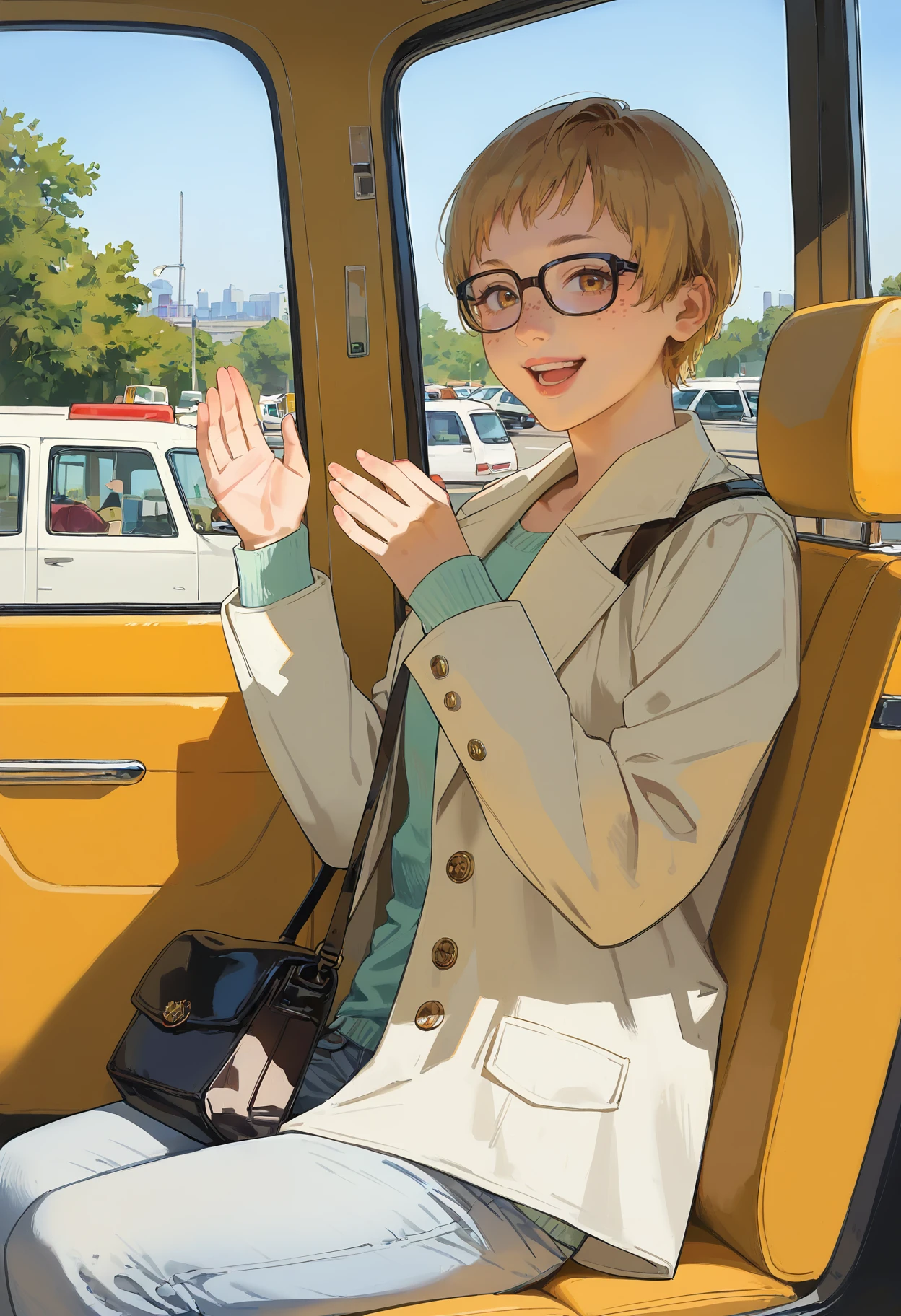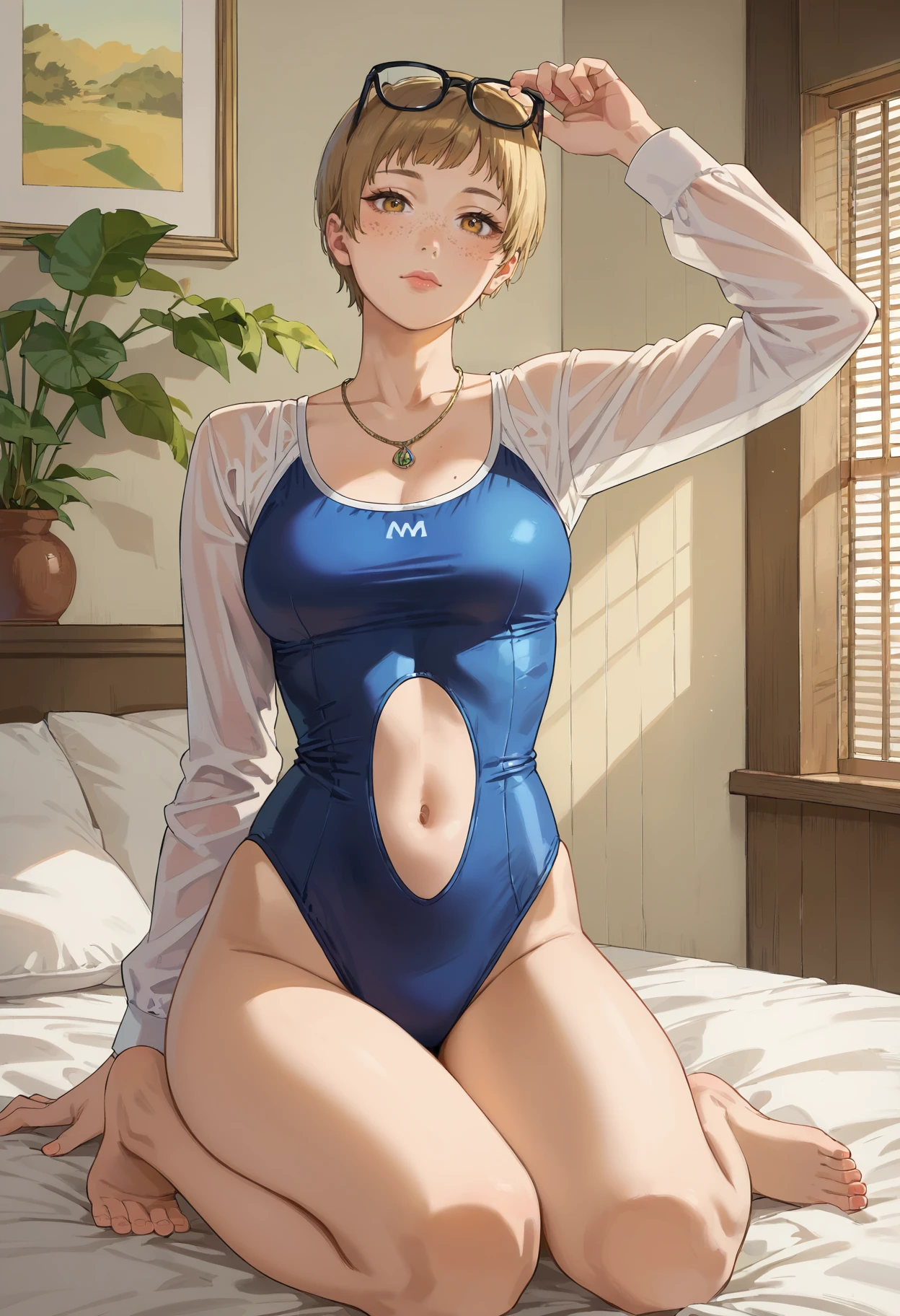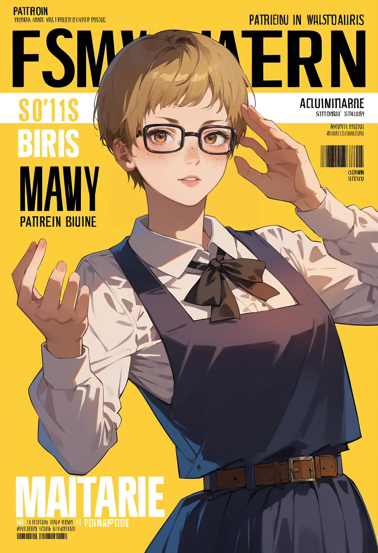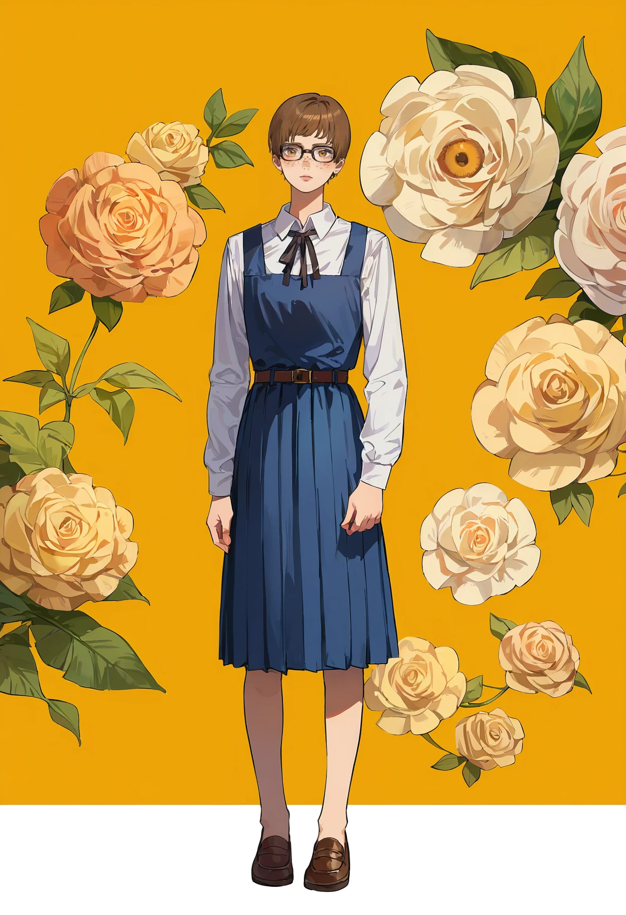 Outfit 1: 1girl, glasses, short hair, dress, pinafore dress, school uniform, shirt, ribbon, long sleeves, white shirt, collared shirt, brown eyes, black ribbon, brown hair, blonde hair, belt, neck ribbon, bangs, black-framed eyewear, black dress, yellow eyes, freckles