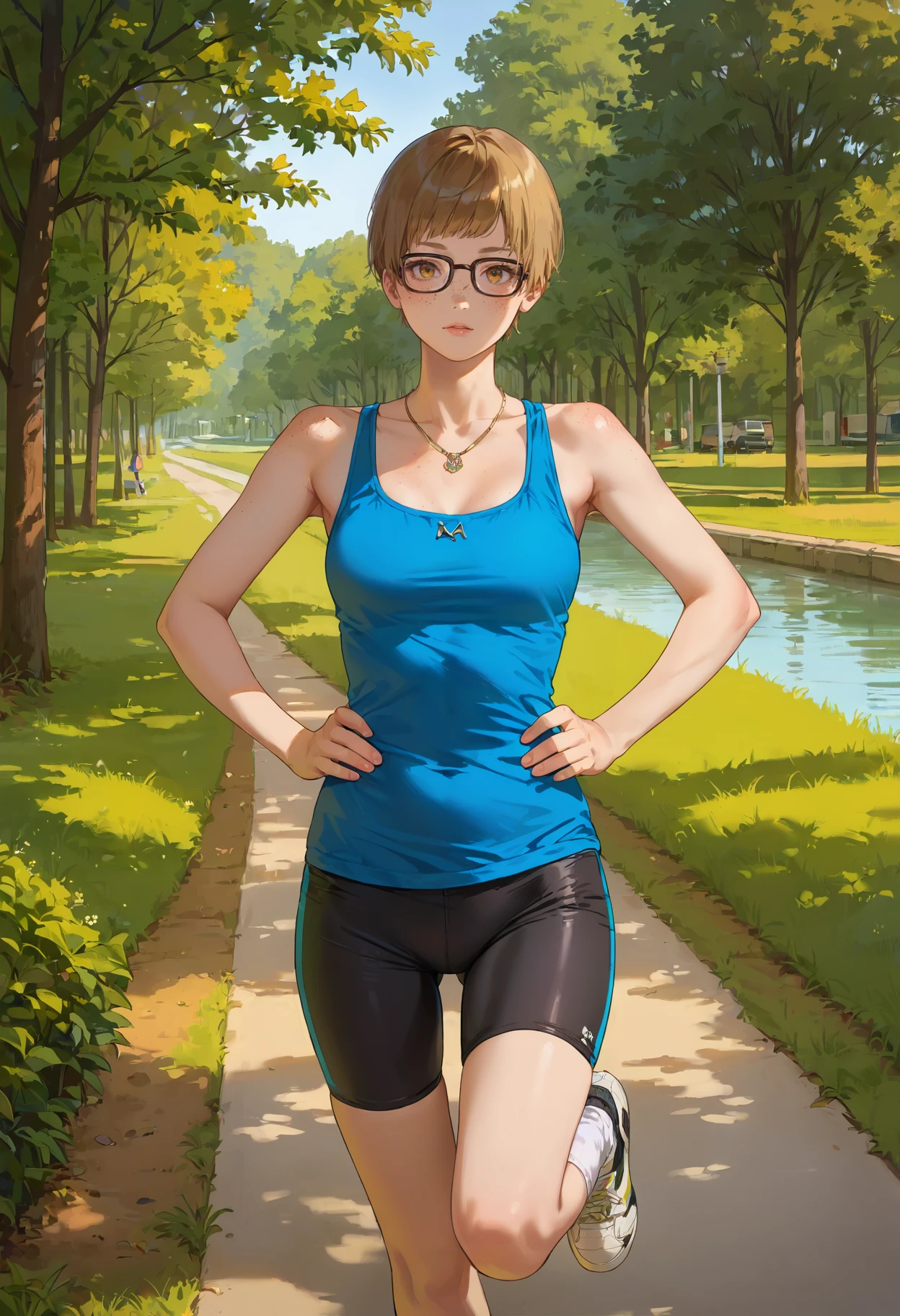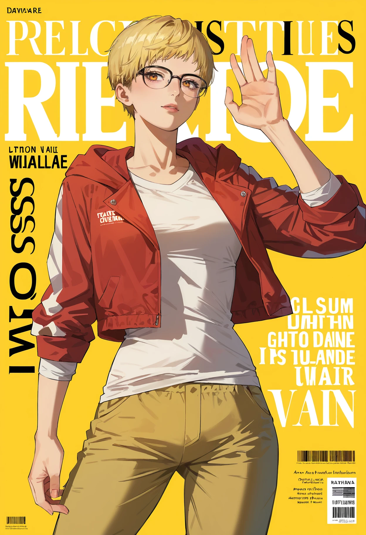 Outfit 2: glasses, blonde hair, short hair, jacket, pants, 1girl, shirt, white shirt, hood, open clothes, long sleeves, pants rolled up, capri pants, red jacket, shoes, open jacket, hoodie