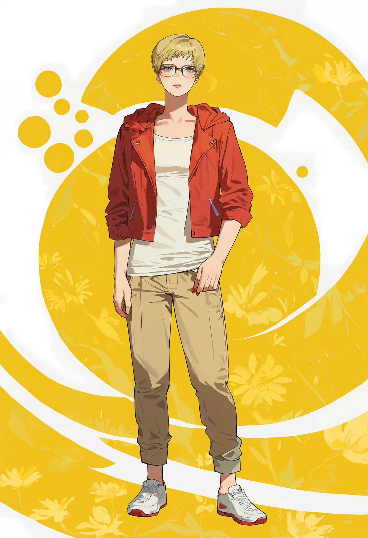 glasses, blonde hair, short hair, jacket, pants, 1girl, shirt, white shirt, hood, open clothes, long sleeves, pants rolled up, capri pants, red jacket, shoes, open jacket, hoodie