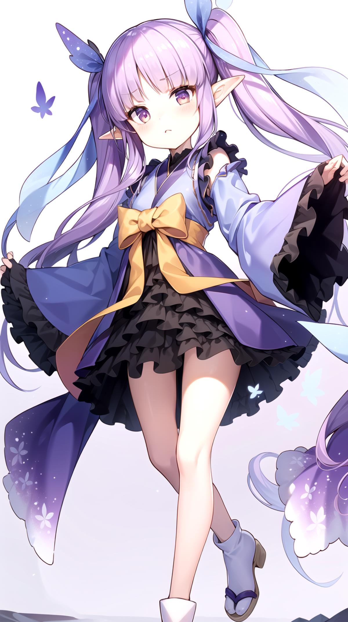 tags - wide sleeves, purple dress, purple orange eyes, pointy ears, black skirt