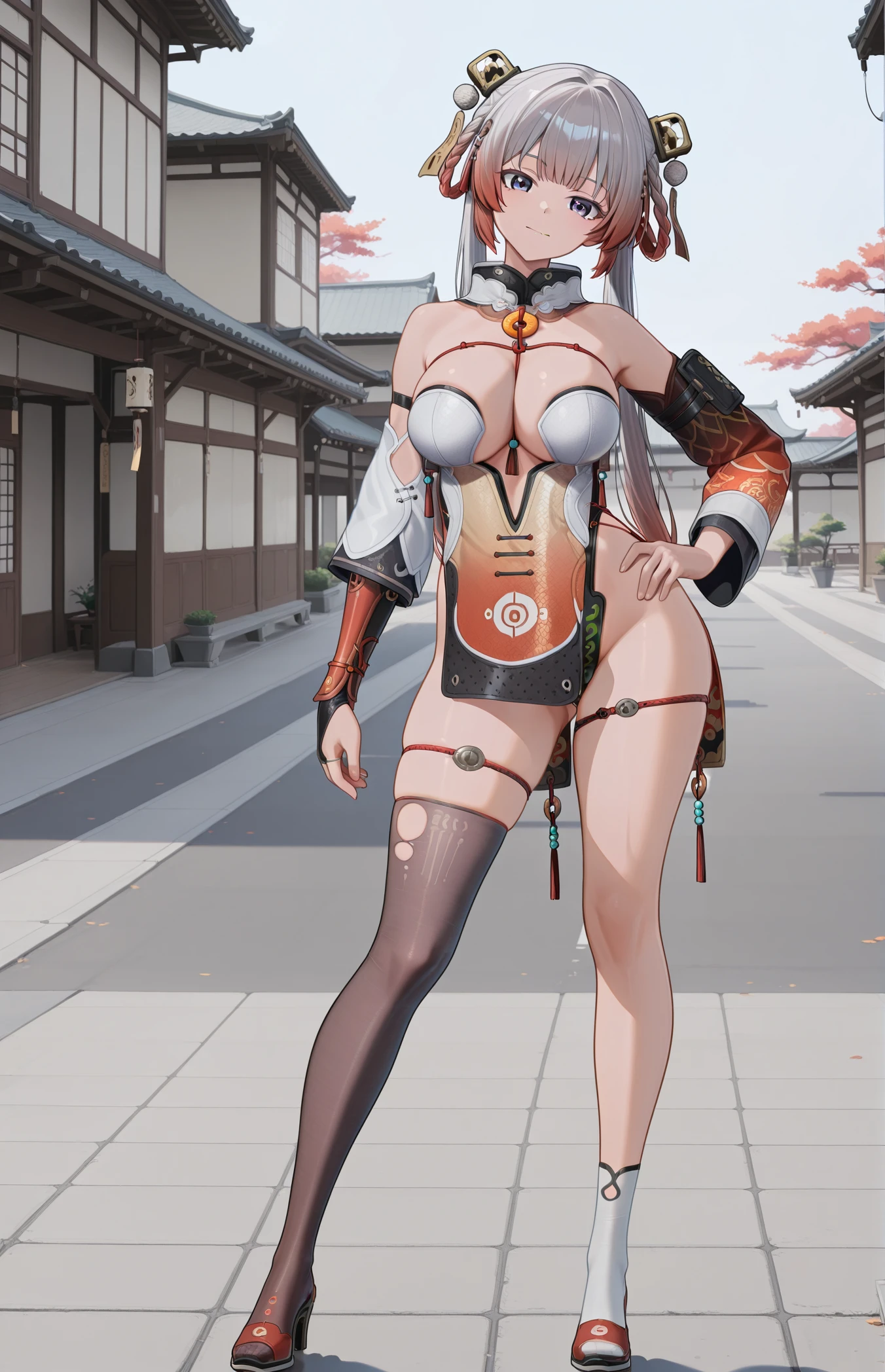 Trigger Words for costume: chinese clothes, detached sleeves, pelvic curtain, leotard, hair ornament, asymmetrical legwear, single thighhigh, single white socks, high heels