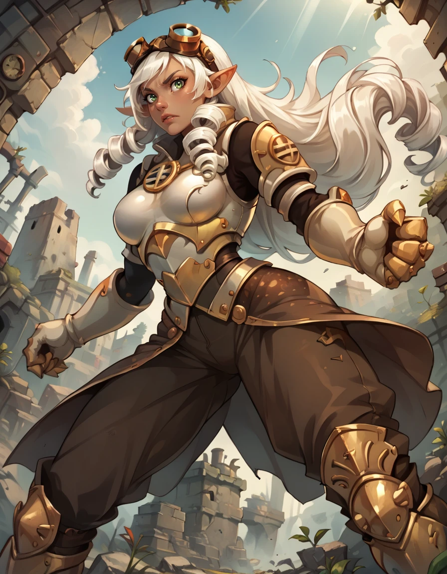 brown eyes, pointy ears, dark-skinned female, white hair, long hair,