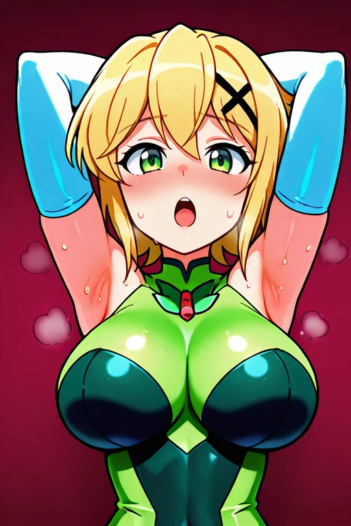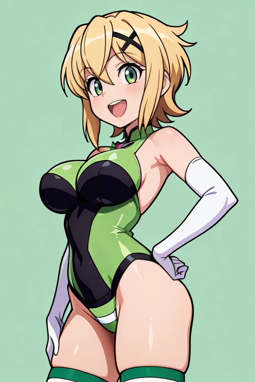 1girl, solo, hdkirikagi, short hair, blonde hair, x hair ornament, green eyes, shiny skin,