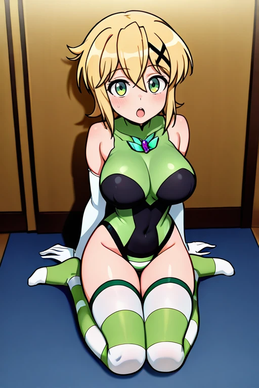 medium breasts, kirikadef, leotard, green leotard, elbow gloves, white gloves, striped thighhighs, striped clothes, skin tight,