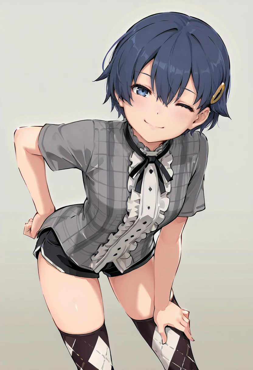 s-wear_sora, hairclips, neck ribbon, black ribbon, center frills, white frills, grey shirt, plaid shirt, short-sleeved shirt, untucked shirt, black shorts, short shorts, black thighhighs, argyle thighhighs, brown loafers