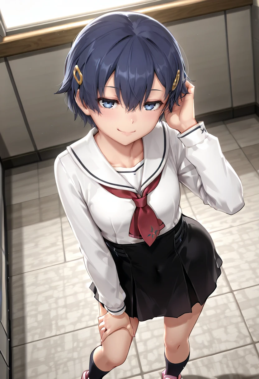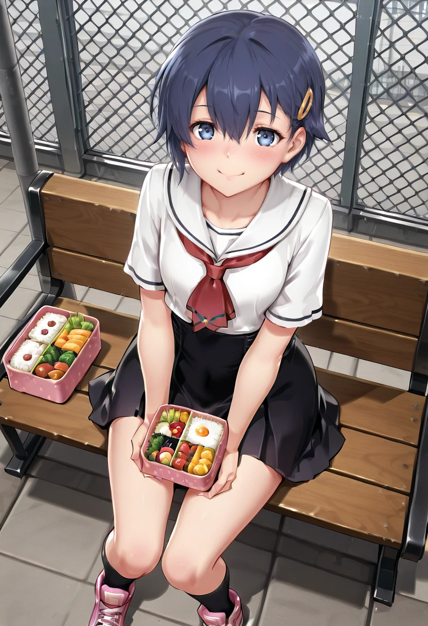 uniform_sora, hairclips, sailor collar, red neckerchief, white shirt, short sleeves, high-waist skirt, black skirt, pleated skirt, black socks, knee socks, pink sneakers