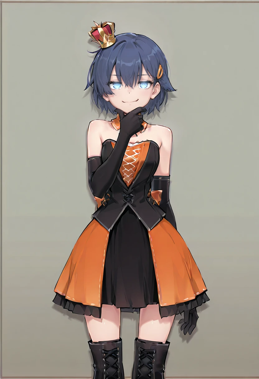 aufest_sora, hairclips, mini crown, detached collar, black vest, orange dress, bare shoulders, black gloves, elbow gloves, skirt under dress, black skirt, black boots, knee boots