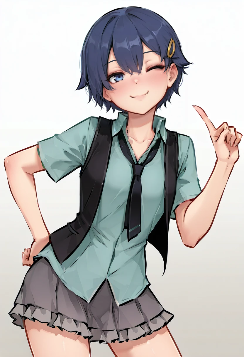 cas_sora, hairclips, loose necktie, black necktie, black jacket, sleeveless jacket, , aqua shirt, short-sleeved shirt, untucked shirt, frilled skirt, grey skirt, miniskirt, aqua loafers